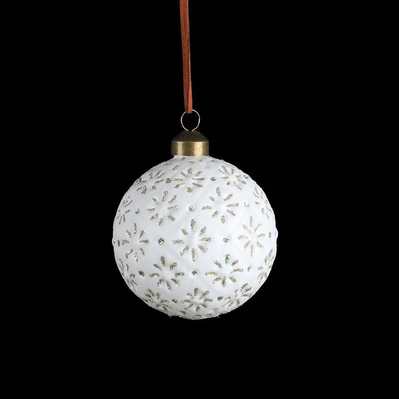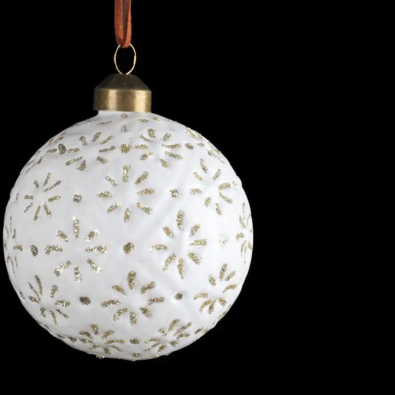 This elegant White Glass Bauble features a stunning Gold Floral Design, adding a touch of sophistication to your holiday decor. Elevate your festivities with this exquisite ornament.