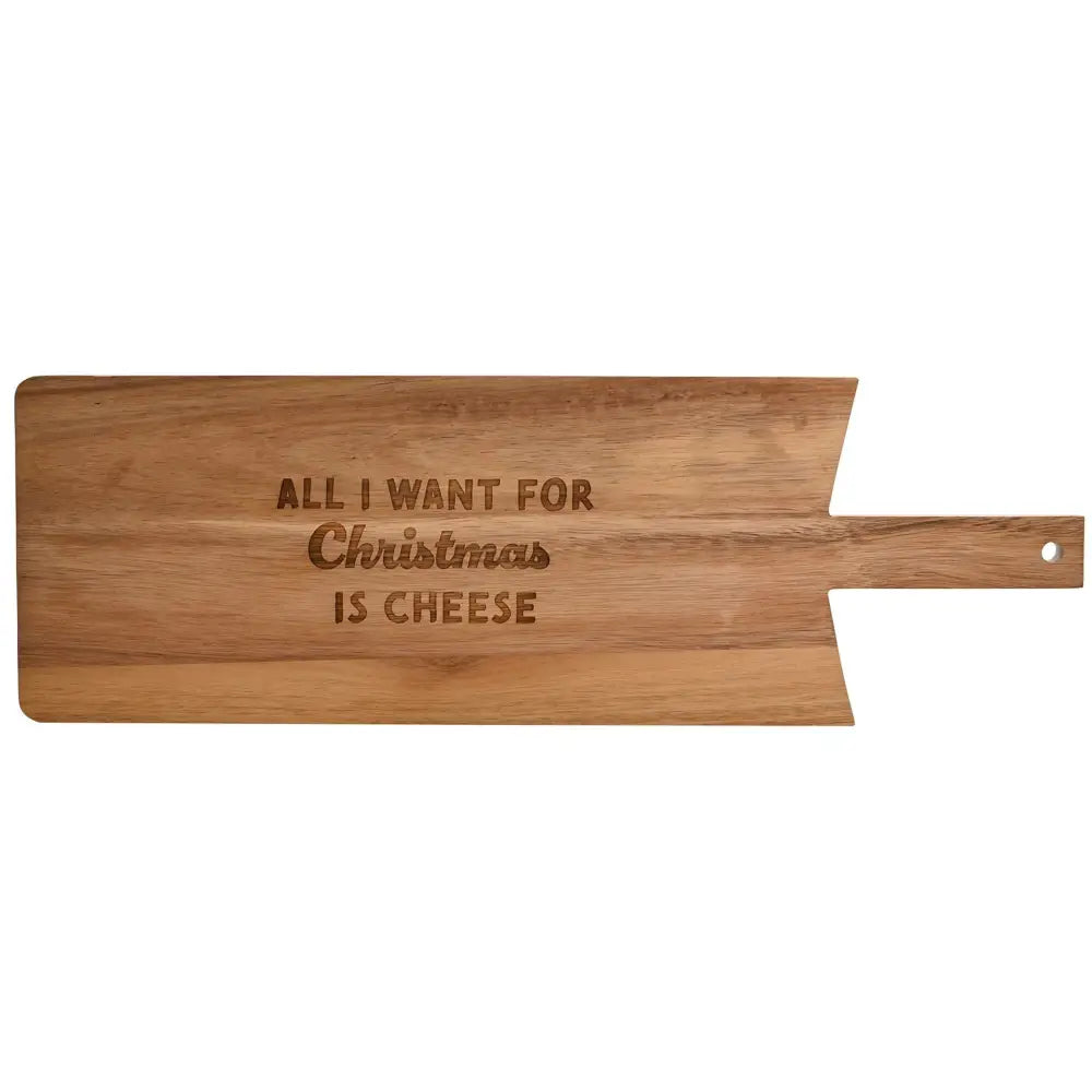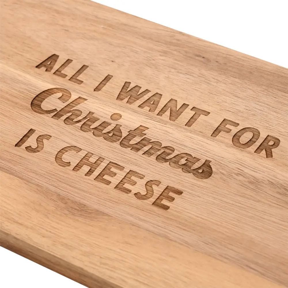 This rectangular serving board is perfect for presenting a variety of cheese in a stylish way. Crafted using quality wood, the board includes a festive engraved 'All I Want For Christmas Is Cheese' slogan. Enjoy a delightful spread of cheese at your next special event.