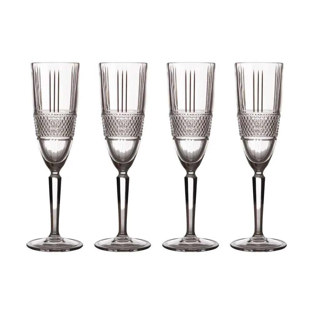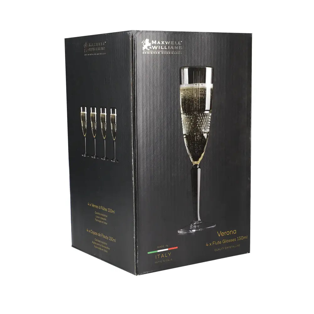 Set of four champagne flutes 150ml capacity. Crystalline glass & dishwasher safe.