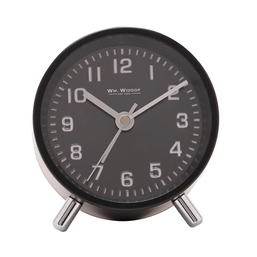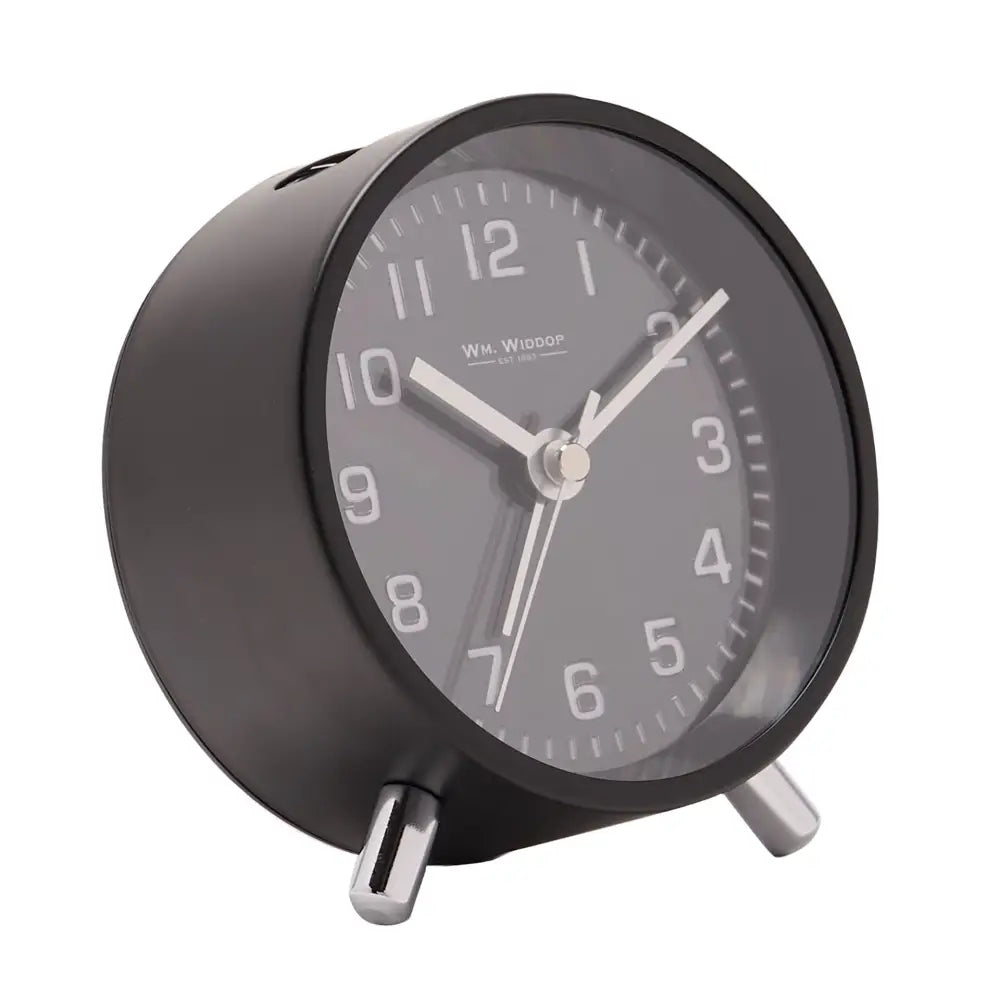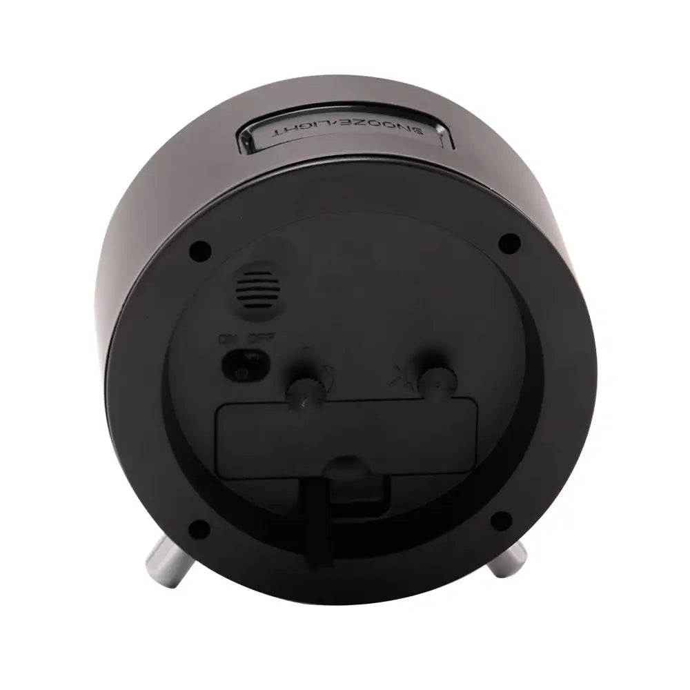 The round alarm clock showcases a black matt finish, matching clock face and white light up Arabic dial. It is completed by silver clock hands and sweep movement.