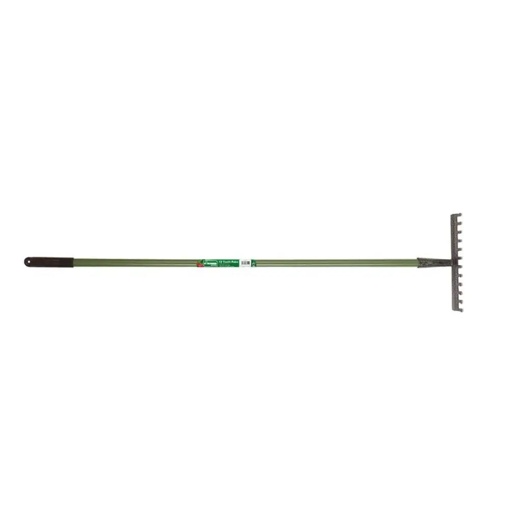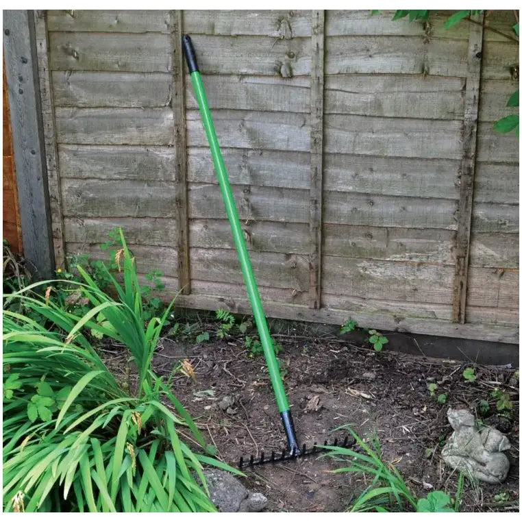 The Kingfisher Garden 12 Tooth Rake is the perfect tool for all your gardening needs. With its scarifying, turning, breaking, and clearing capabilities, it's versatile and efficient. The ergonomically shaped handle provides a comfortable and secure grip, while the heat treated carbon steel ensures durability for long-lasting use.