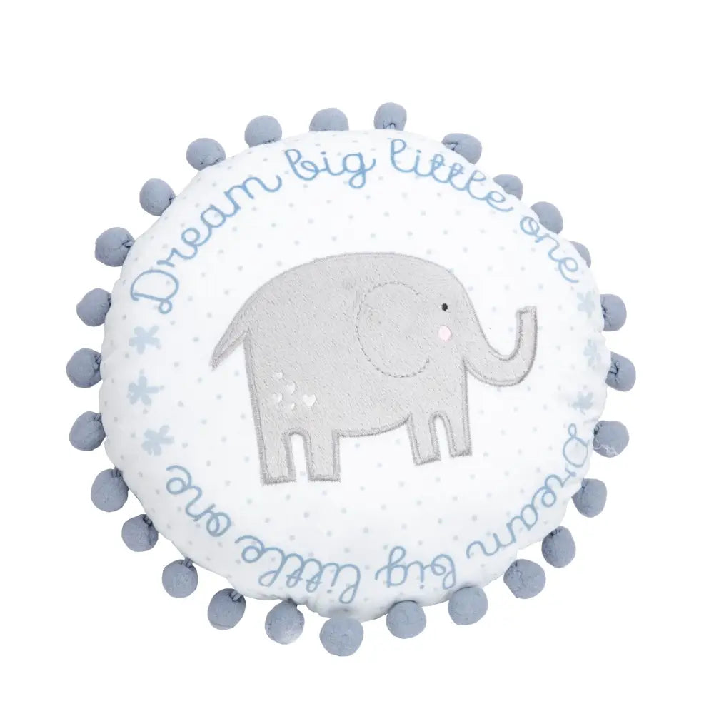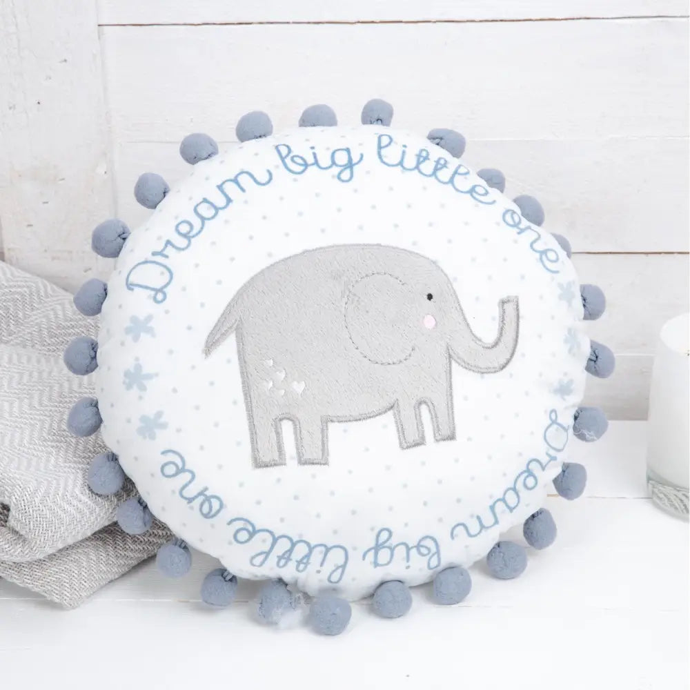Bring some snuggly comfort to a nursery or bedroom with this adorable DREAM BIG LITTLE ONE circular throw cushion.This super soft 30cm fabric cushion features a cute grey elephant design with blue border lettering and blue bobbly trim around the edge. Wipe clean only.