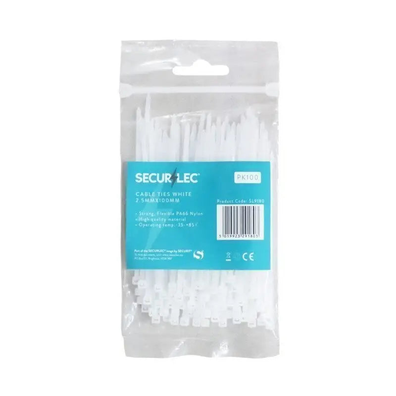 Secure your cables with ease with Securlec Cable Ties. This pack contains 100 ties, range goes from 2.5mm - 4.8mm, providing strong and secure fastening for all your needs. Keep your cables organized and tidy with these durable and reliable cable ties.