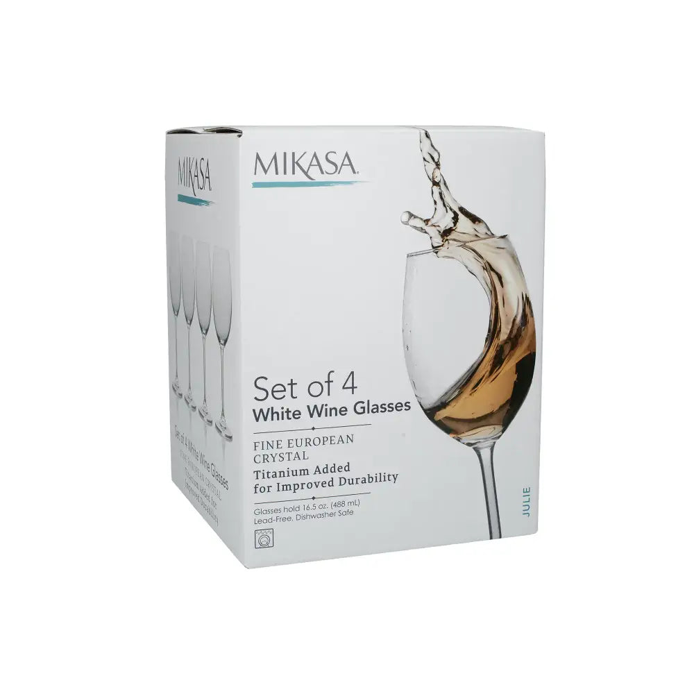 These elegant white wine glasses from the Julie collection are made of fine European crystal giving beautiful light refractions with an exquisitely thin and crisp rim. The glass is lead-free and added titanium improves durability. A beautifully blown bowl sits atop a slim stem with a sturdy base, making this wine glass set both beautiful and functional for every day dinners or more special occasions.