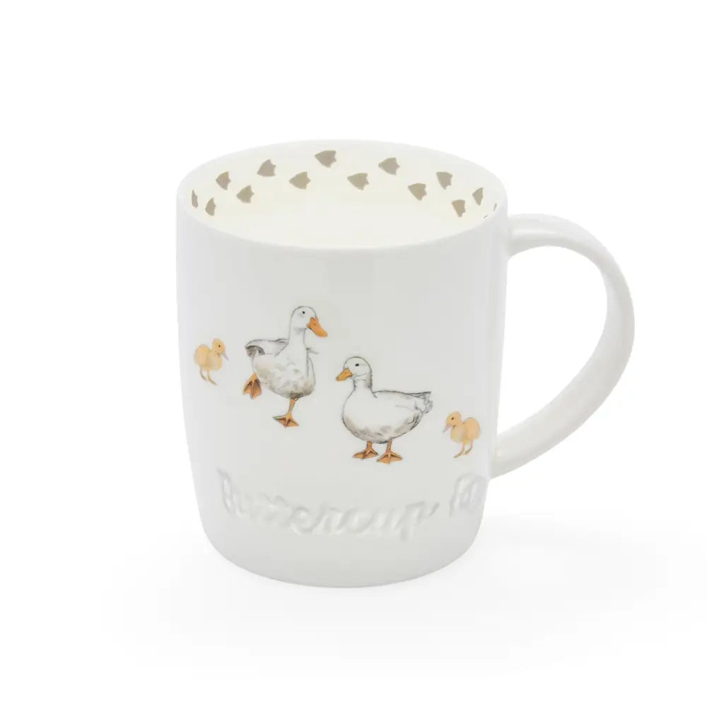 This barrel mug features ducks and ducklings. It is embossed with Buttercup Farm and foot prints on the inside of the mug.