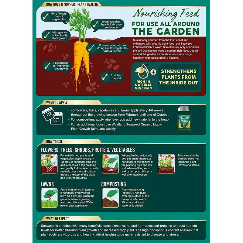 Westland Seaweed Enhanced Plant Growth Stimulant is a nourishing feed for use all around the garden. Sustainably sourced from the Irish coast and enhanced with organic plant food. Our Seaweed Enhanced Plant Growth Stimulant not only conditions the soil but also provides a nutrient rich food. Use this feed all around your garden for an abundance of stronger, healthier vegetables, fruits & flowers.