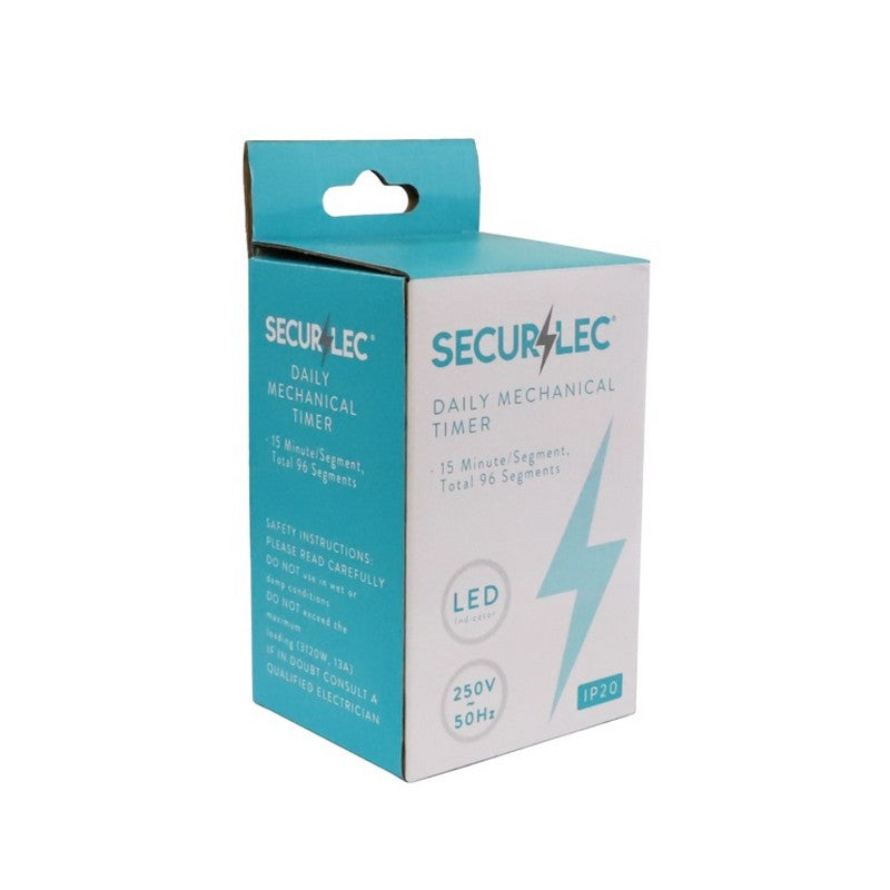 Take control of your electrical devices with the Securlec Mechanical Plug In Timer. This straightforward IP20-rated timer automates your appliances, allowing you to set precise on and off schedules without batteries or complicated programming. Perfect for managing heating, lighting, and entertainment systems, it helps reduce energy consumption whilst enhancing home security by simulating occupancy when you're away. The mechanical design offers reliable operation with no digital displays to fail, ensuring consistent performance year after year. Compact and discreet, it fits neatly behind furniture without cluttering your space. Simplify your daily routine and enjoy the convenience of automated control with this dependable, user-friendly solution.
