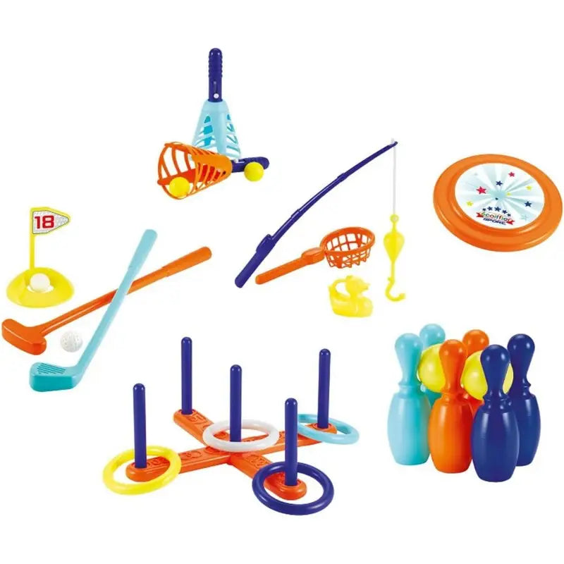 - PACKAGE CONTENT: This set contains 1 duck fishing, 1 frisbee, 1 golf game, 1 ball toss game, 1 ring toss game, 1 bowling game.