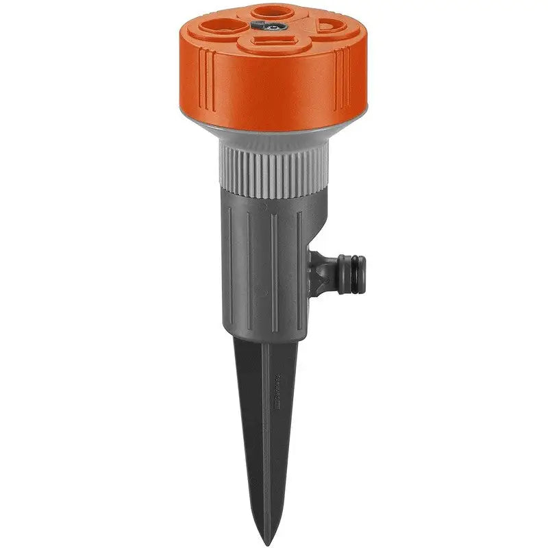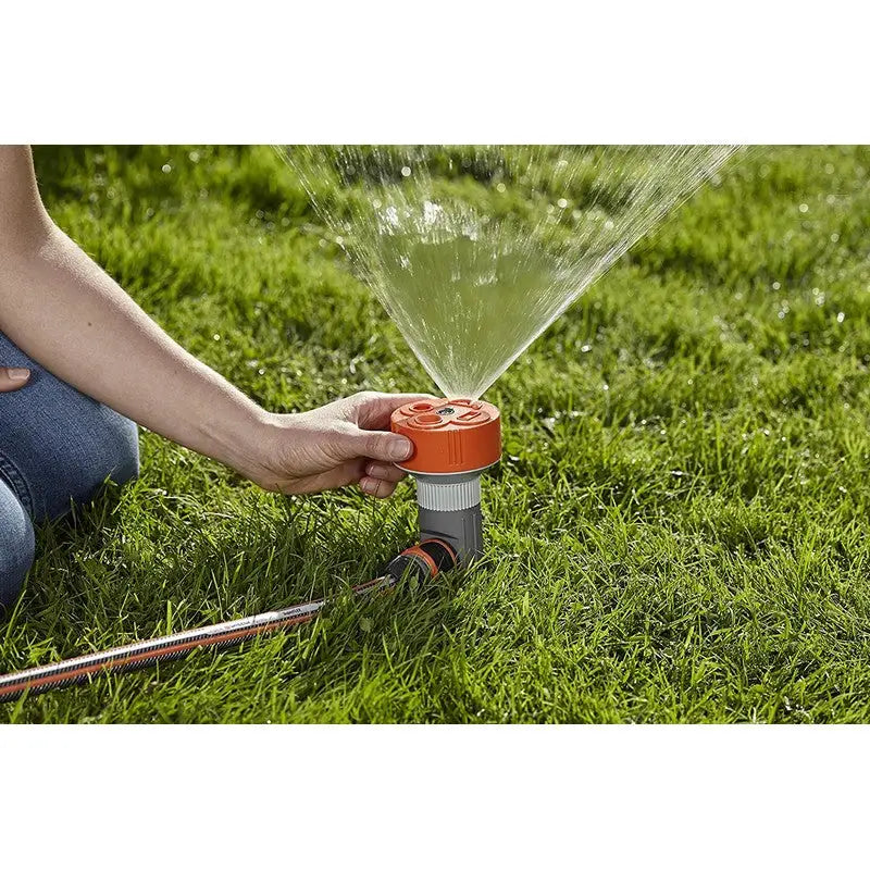 The GARDENA Classic Twist 4-Sprinkler Action offers a sprinkler that can be used to irrigate four different shaped surfaces: circles, semicircles, squares and rectangles. You can easily select the desired shape by turning the dial. The package also includes a GARDENA quick hose element (item no. 915). Dimensions of irrigable surfaces: circle: max. 10 m / 80 m; semicircle: r = max. 8 m / 100 m ²; square: max. 8 x 8 m / 64 m ²; rectangle: max. 16 x 2 m / 32 m ². The device is held by a stable pin. This allows the GARDENA Twist 4-Sprinkler to be easily and safely mounted on the lawn or on the ground, but easily removed and moved when needed. With the GARDENA Classic Twist 4-Sprinkler, you can optimally water your garden according to your needs.