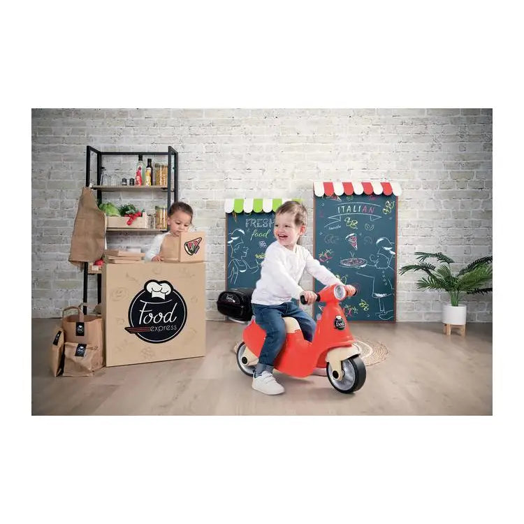 The Food express scooter ride-on will delight your child with its modern and colourful design! With the luggage rake and the removable top case, your little one can play at preparing all kinds of meals and delivering them! Thanks to the scooter's height (47.5cm), your little-one will be able to go on an adventure from his 18 months! The scooter also has 1 realistic front plastic height, 1 mechanical key, and 1 toy box under the seat. The silent wheels guarantee pleasant and peaceful rides.