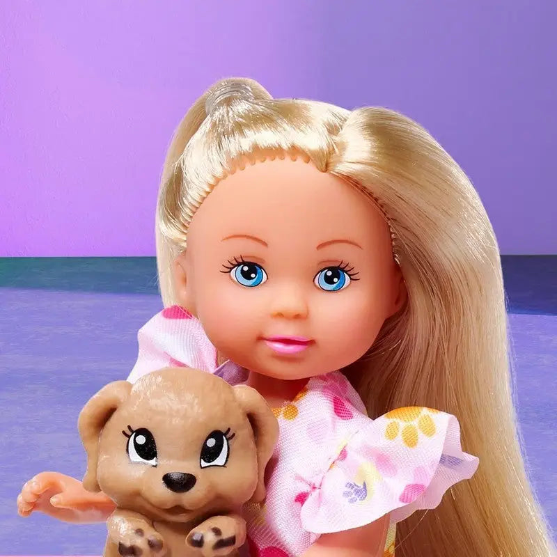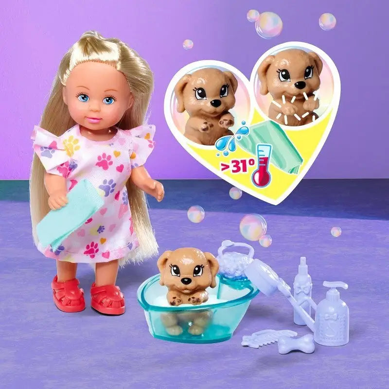 - Playing fun with the dog and the bathtub – The 12 cm tall Evi lovingly looks after her dog who has dirt on his paws. Thanks to the colour change function, the paws can be cleaned and washed clean in the included bathtub, making the game even more realistic.