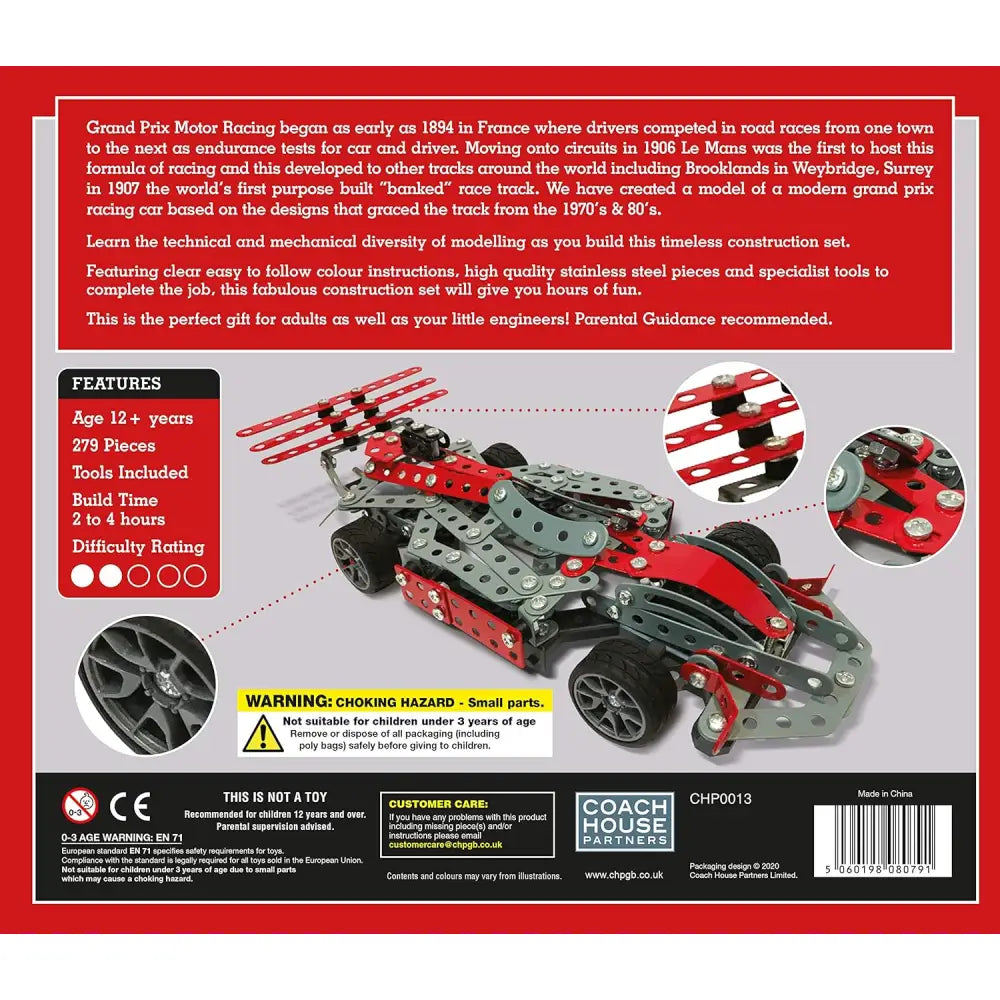 This 279-piece Metal Construction Set allows you to build a Racing Car with detailed pieces and tools. Constructed with real metal pieces, this set provides a realistic and sturdy building experience. Enjoy the challenge of designing your own vehicle, while having fun and mastering building skills.
