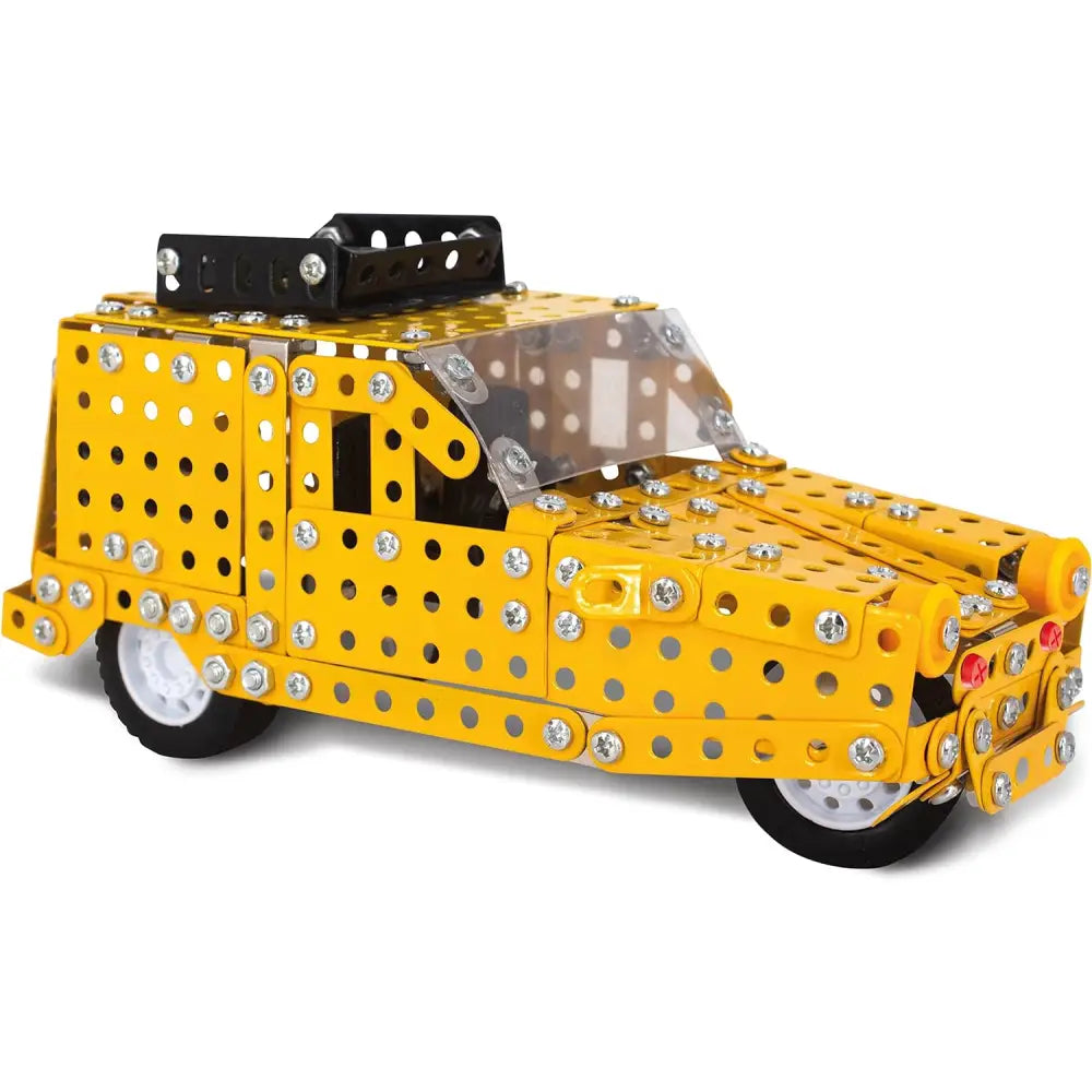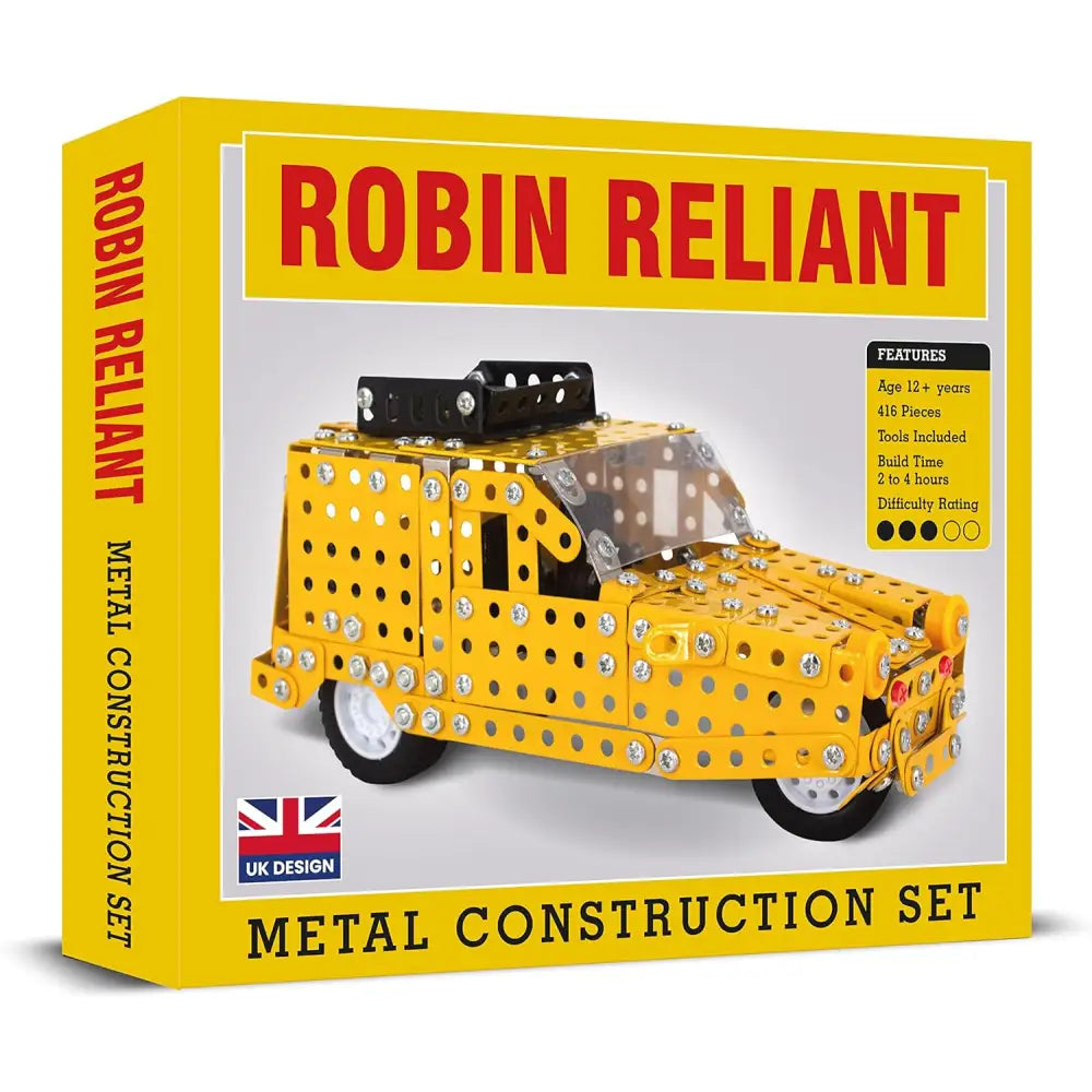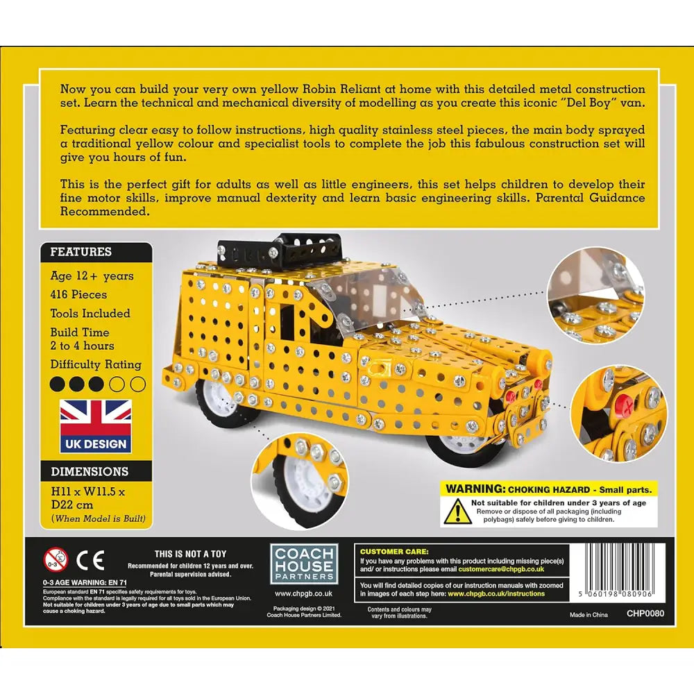 This 417-piece Metal Construction Set allows you to build the iconic Robin Reliant with detailed pieces and tools. Constructed with real metal pieces, this set provides a realistic and sturdy building experience. Enjoy the challenge of designing your own vehicle, while having fun and mastering building skills. A must have for car fans and those who enjoy building.
