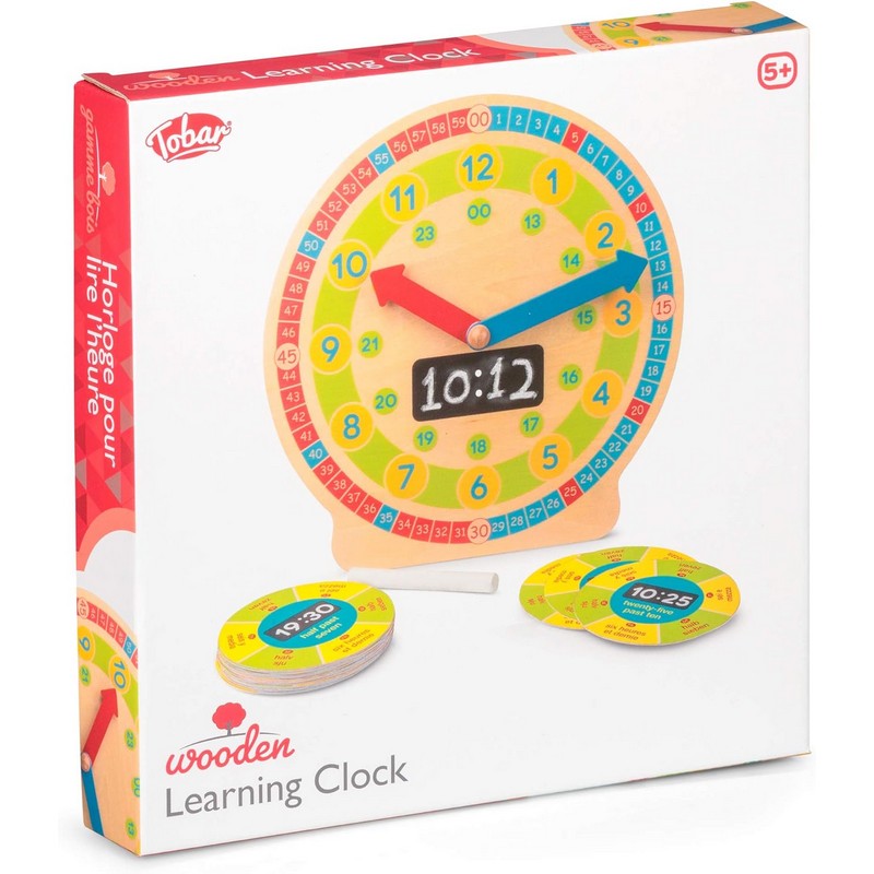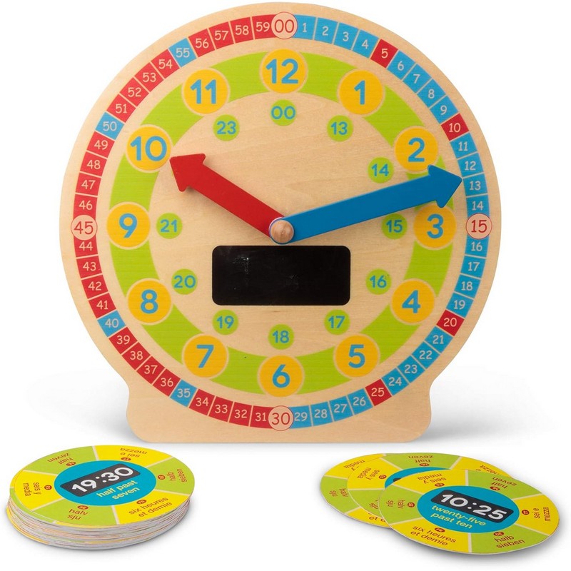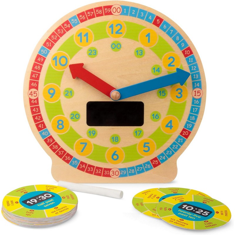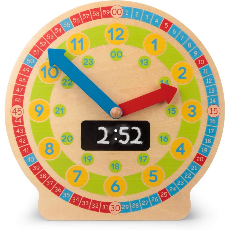 - A great way to help kids learn how to tell time, both analog and digital. This solid wood clock stands up tall and has moveable hands and a chalk board to write down the time.