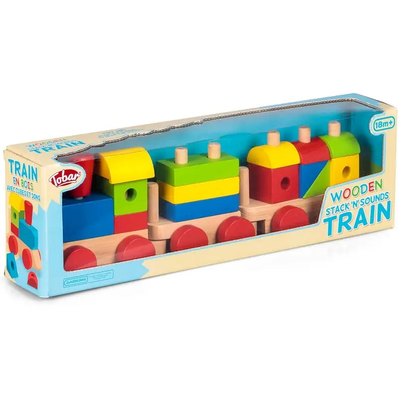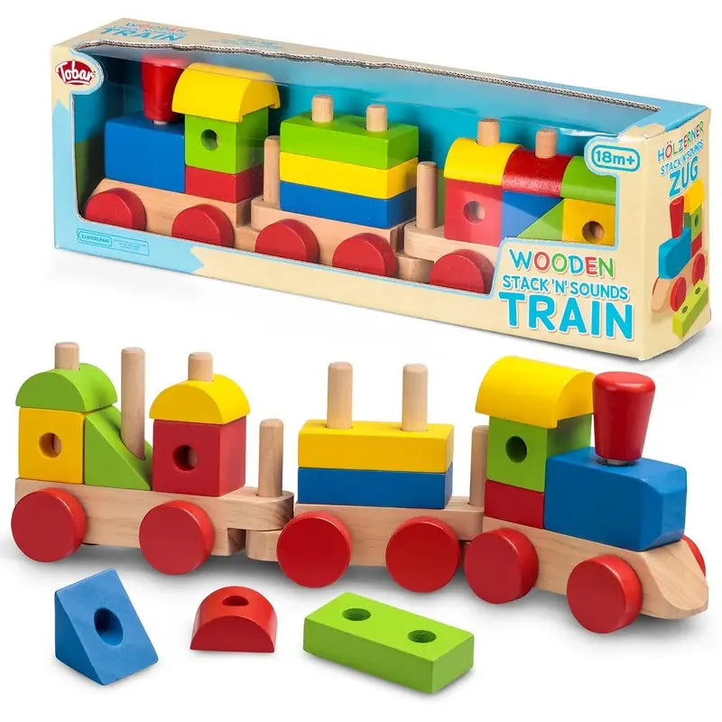 - A beautiful, solid wood stackable train set. Press down of the smmoke stach and hear 3 train sounds.