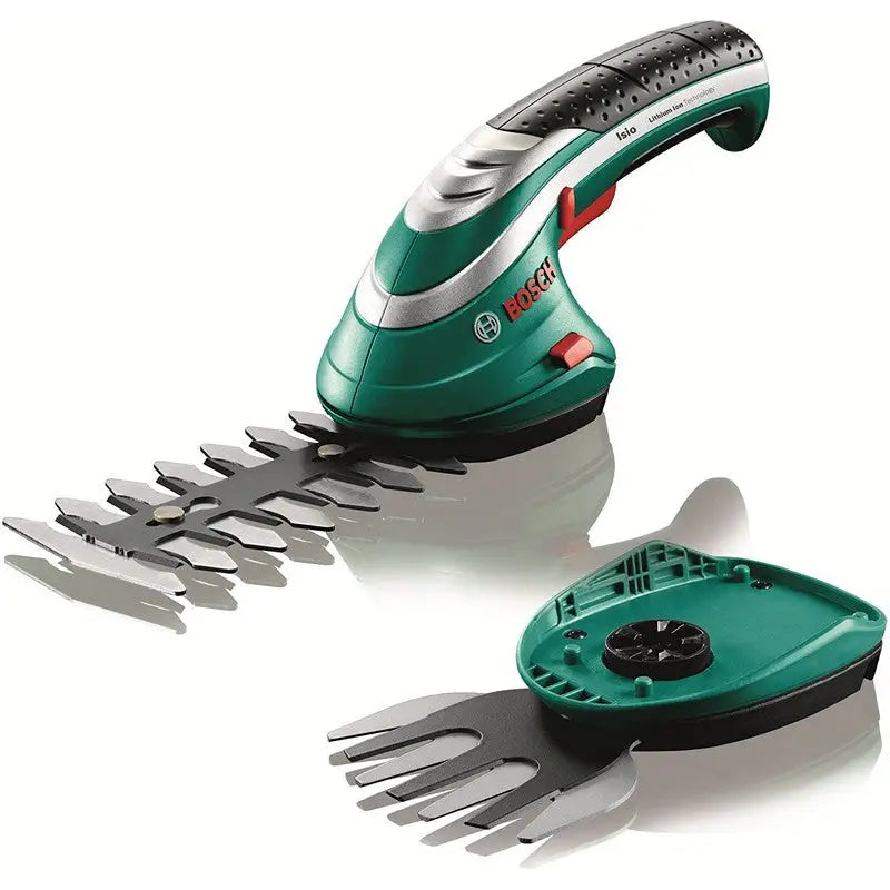 - Items included: Bosch Isio, charger, Multi-Click grass shearing blade 8 cm, Multi-Click shrub shearing blade 12 cm, cardboard box