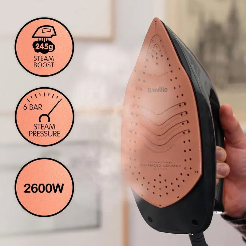 The Breville PRESSXPRESS 2600W Iron is an expertly designed iron with innovative PerfectTEMP Technology. Achieve perfectly pressed garments with ease. No more guessing - this iron delivers consistent steam heat at the ideal temperature for each fabric type. Professional performance in a sleek black design.