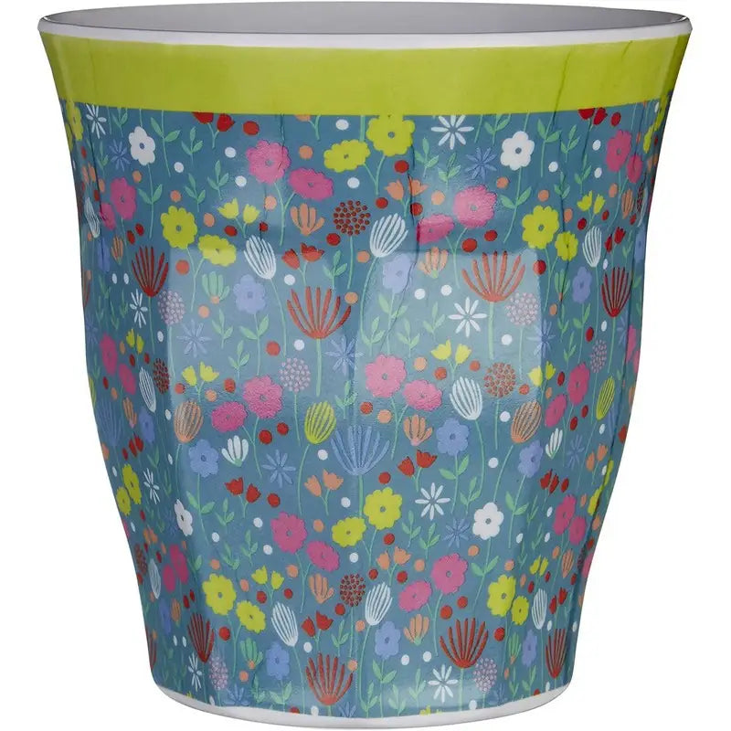 - Cool teal background provides a muted canvas for the plethora of flowers, while a green rim adds to its vivid appeal