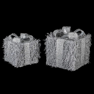 Add a touch of Winter to your home with our Set of 2 Lit Grey Glitter Presents. Its a timeless and stylish piece that you can use every year.