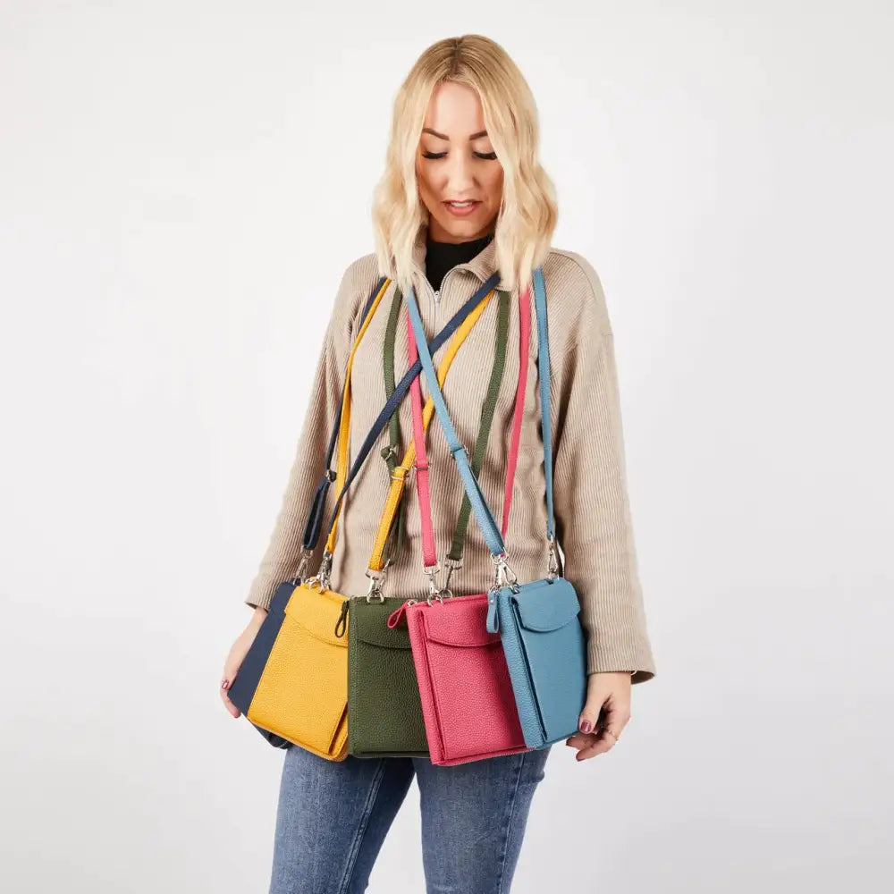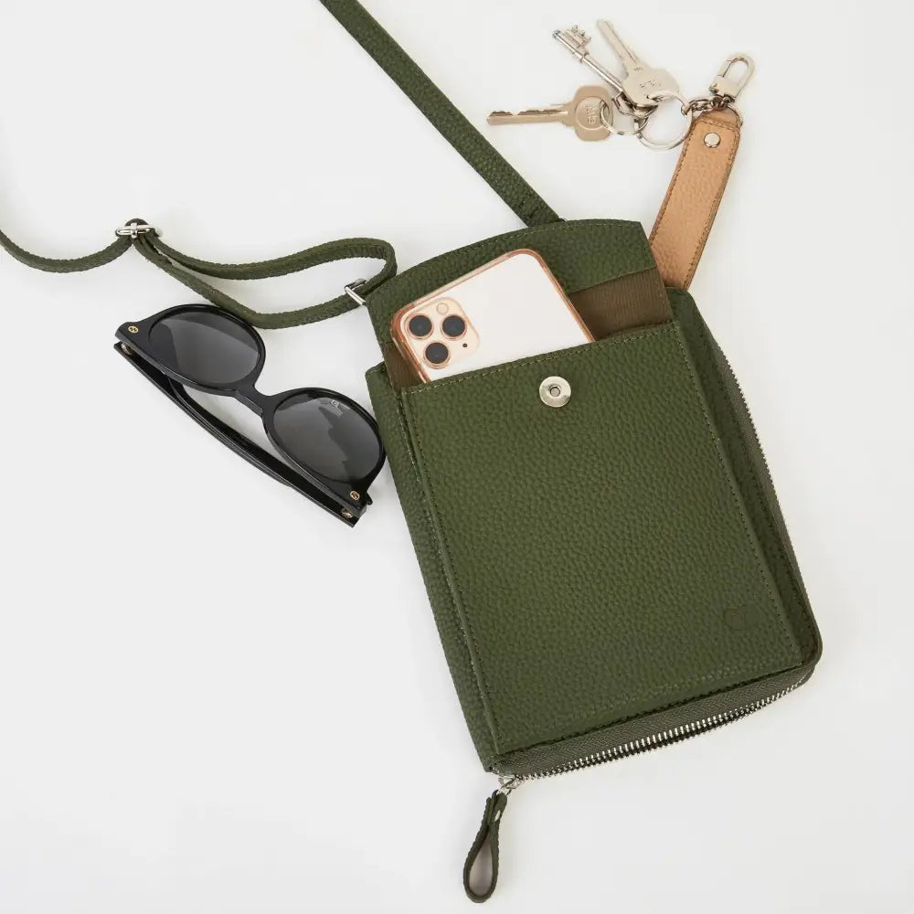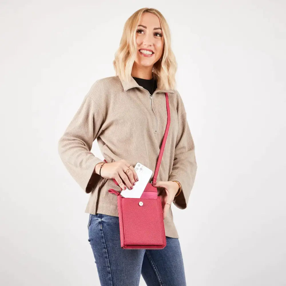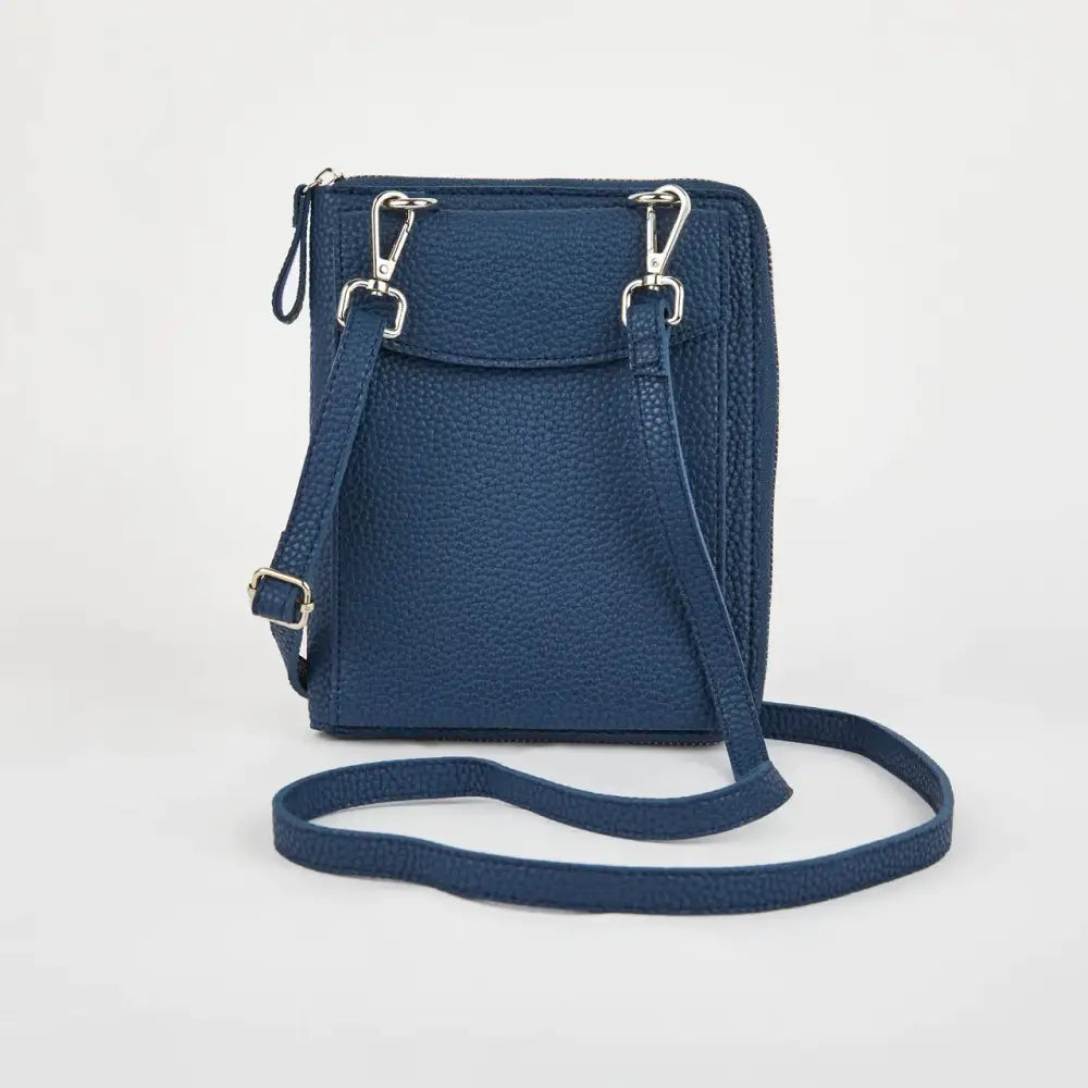 The Columbian Cross Body Bag is crafted from soft grain PU and tested to fit an iPhone Pro Max. It has a slimline design and an adjustable, detachable strap. The zip-around purse includes 6 card slots, a slip pocket, and a single main compartment. Measurements: 16 cm x 17 cm x 4 cm (including the front pocket).