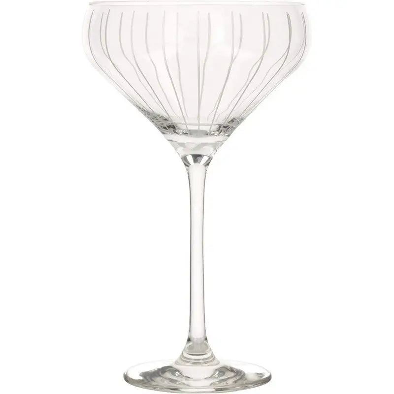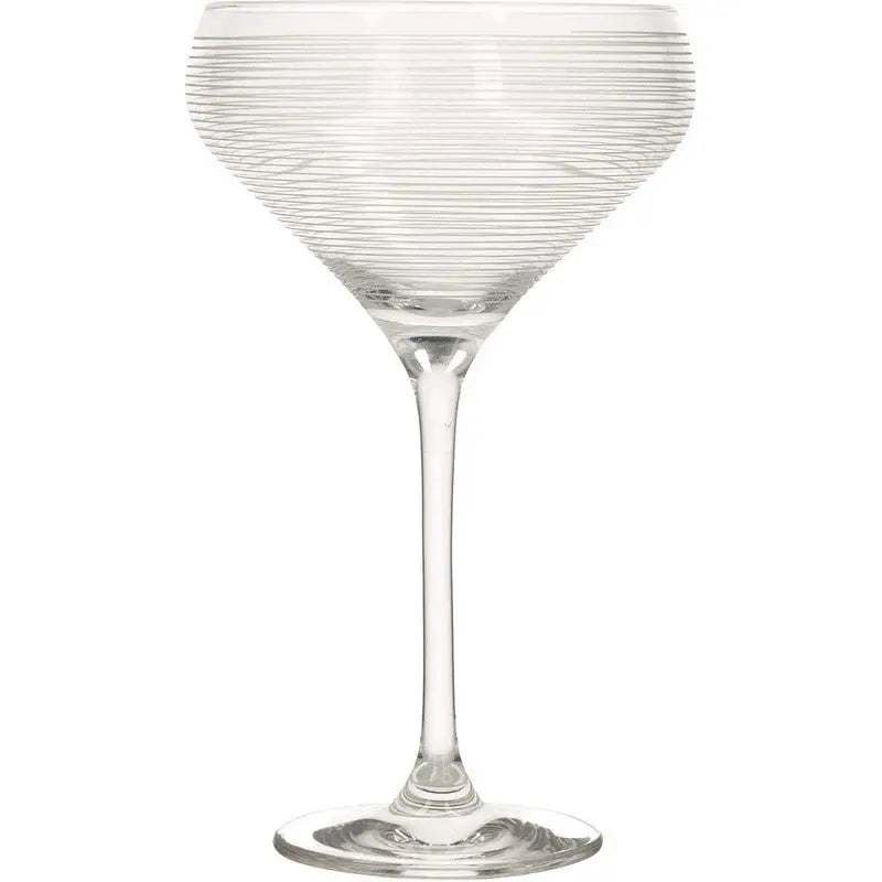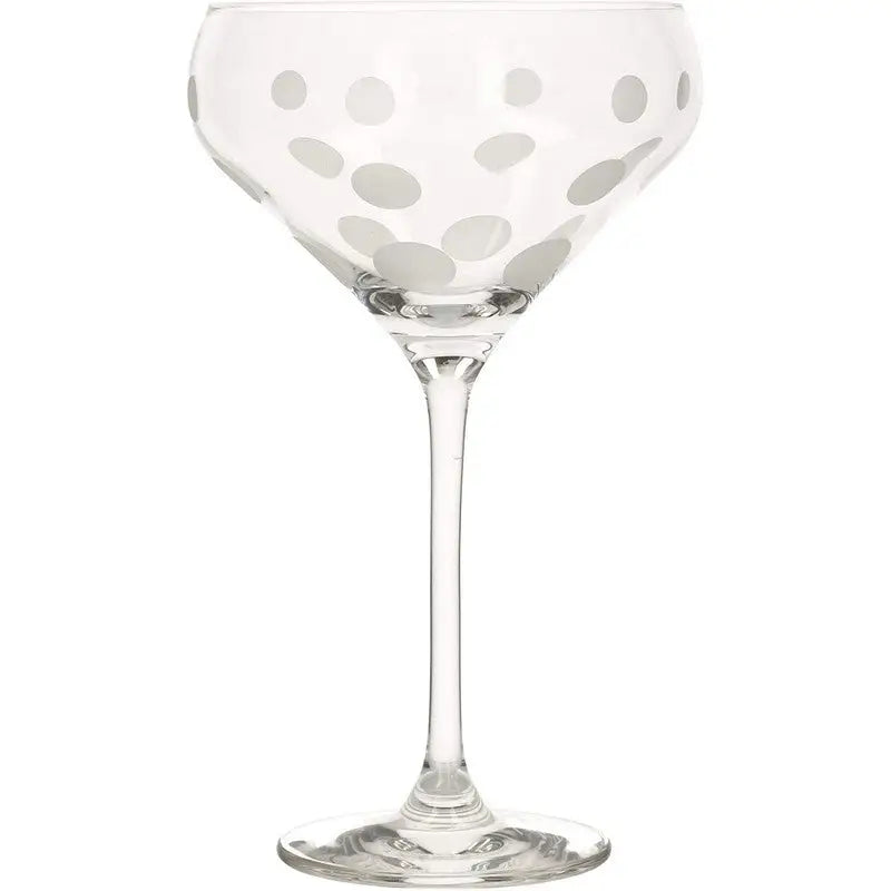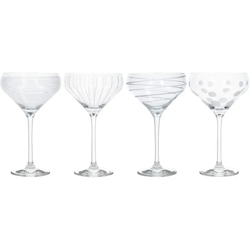 Party in style with this set of four champagne saucers from tabletop industry leader Mikasa. Be unique with precision-etched designs in a sophisticated, coordinating collection. Made of stunning crystal glass, each champagne glass is decorated with its own distinct, celebration-ready design. Guests will be delighted when you serve them bubbly or sparkling wine in their own glass, etched with shimmering silver sweeps, loops or dots. You Don't have to save them for parties, though. Bring them out when you're celebrating good news - whether with friends or a loved one. This set comes in a beautiful gift box, making it a wonderful gift for anyone who loves to entertain, or who simply appreciates elegant glassware.