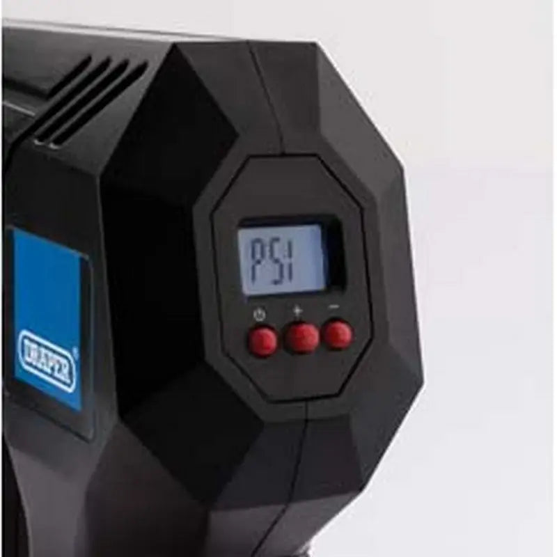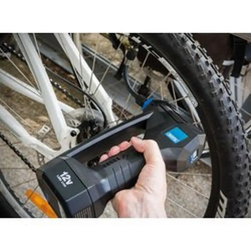 This cordless 12V air compressor has an LCD digital display, which provides PSI, KPA and BAR pre-sets enabling the user to fix their desired air pressure. Once the set pressure is reached the compressor automatically stops. It is fitted with a bright LED lamp for visibility and an emergency red flashing SOS for attracting attention. Includes 150mm tyre valve connector/air hose and two inflation nozzles suitable for footballs, airbeds and inflatable toys. Supplied with 12V DC in-car power adaptor and mains charger inside a canvas storage bag.