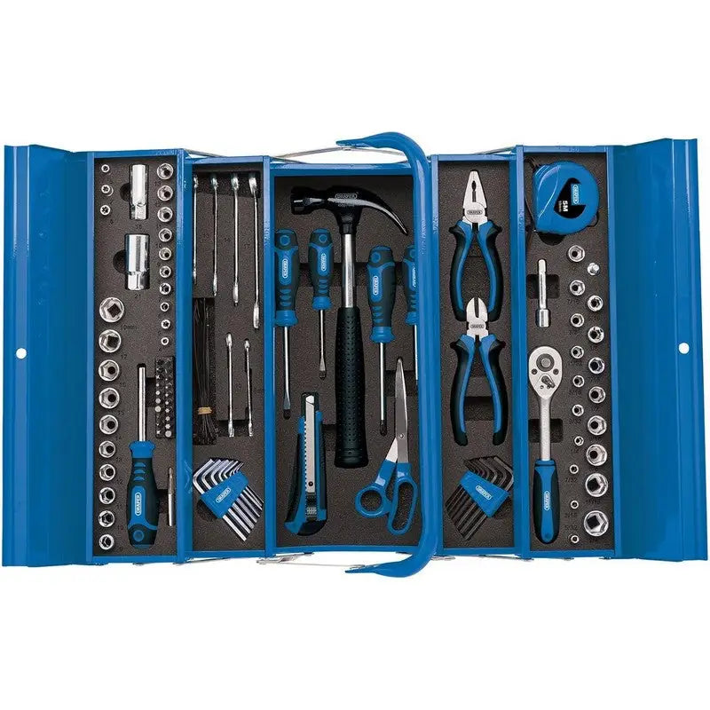 Vast selection of commonly used tools for the workshop and around the home contained inside a steel cantilever toolbox. Featuring a 45-tooth reversible ratchet, 16oz claw hammer, combination pliers, side cutters, a range of screwdrivers, a tape measure and a wide selection of screwdriver bits, sockets and hex keys. Lining the toolbox are high density foam inserts to help organise storage and clearly spot when tools are missing. Cantilever toolbox manufactured from sheet steel with five trays and measuring 420 x 200 x 200mm.