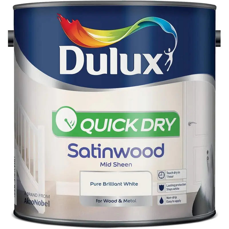 Dulux Quick Dry Satinwood creates a mid-sheen satin finish, providing a subtle, attractive alternative to gloss. It is self-undercoating, wipeable, non-yellowing and suitable for use on interior wood and metal. Thanks to its Quick Dry, low odour formulation, both convenient and pleasant to use.