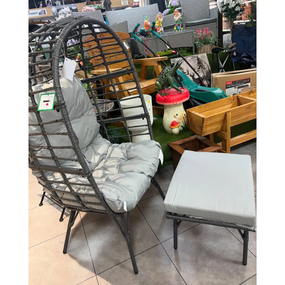 Unwind in style with our Egg Chair Set! This set includes a cozy 76x67x145cm chair and a matching footrest measuring 58x45x43cm. Featuring a trendy grey woven look, this egg-shaped chair is not only stylish but also comfortable. Perfect for relaxing and lounging, it's a must-have addition to any living space.