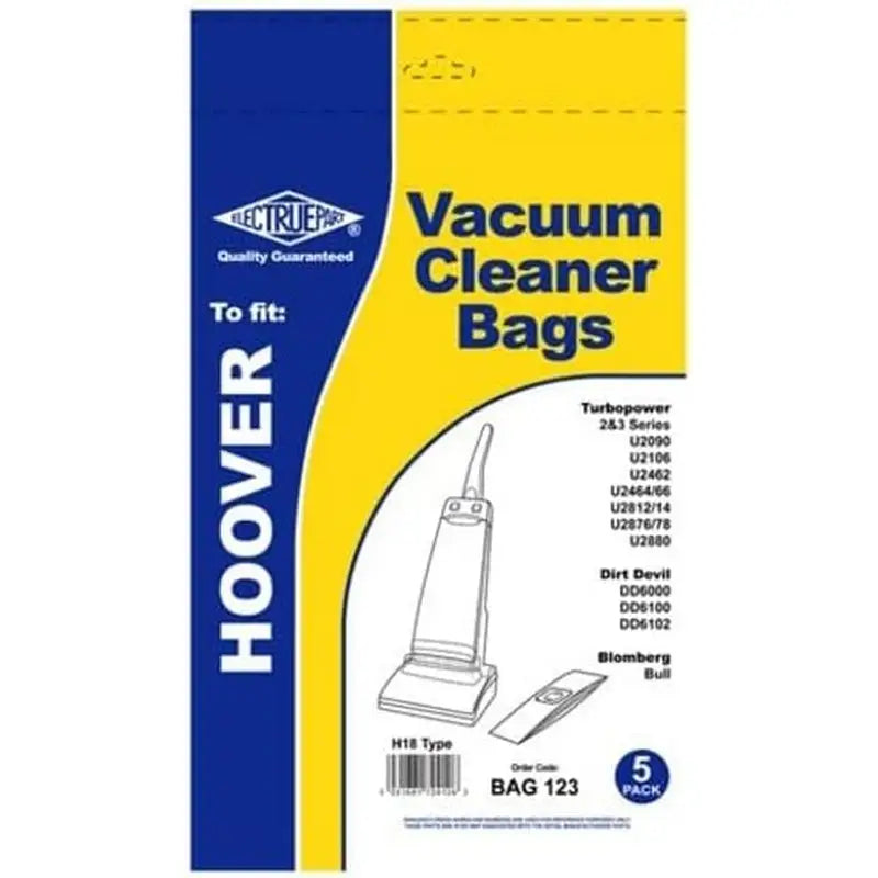 This pack includes 5 Electrupart H18 Hoover vacuum bags, designed to fit model BAG 123. Made with high-quality materials, these bags provide maximum filtration and dust retention, ensuring a thorough and efficient cleaning experience. Keep your vacuum performing at its best with Electrupart bags.