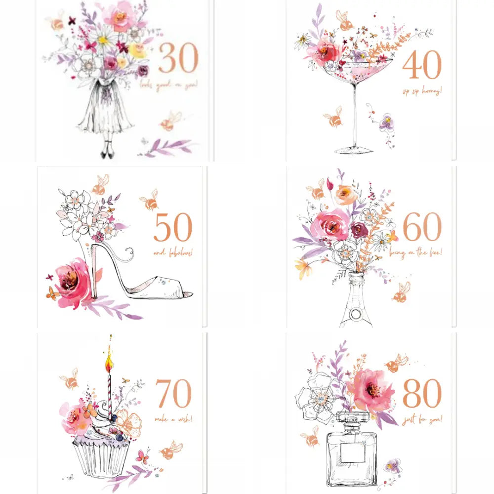 Celebrate a milestone birthday with our Greeting Card Fleur - 30th, 40th, 50th, 60th, 70th and 80th Birthday! This beautifully designed card and blank inside to write your own message. Perfect for the special person turning various ages, this card is a thoughtful and memorable way to show your love and appreciation.