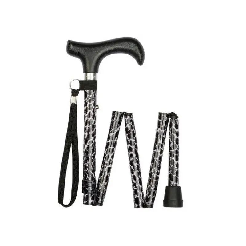 This strong and convenient height adjustable folding walking stick folds into 5 sections, making it small enough to fit into a handbag.
