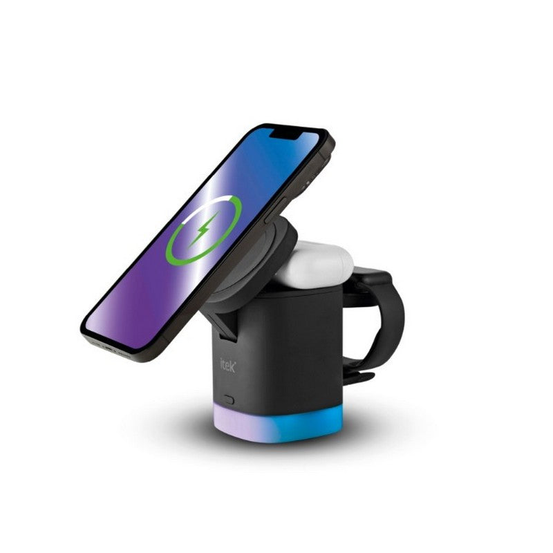 - Charge your phone, earbuds, and watch at once using one cable with the iTek Core I58077BLK 3-in-1 magnetic wireless charger. Features MagSafe compatible technology and extra fast Qi wireless charging, complete with LED smart charge response lights that change colour depending on the device being charged.