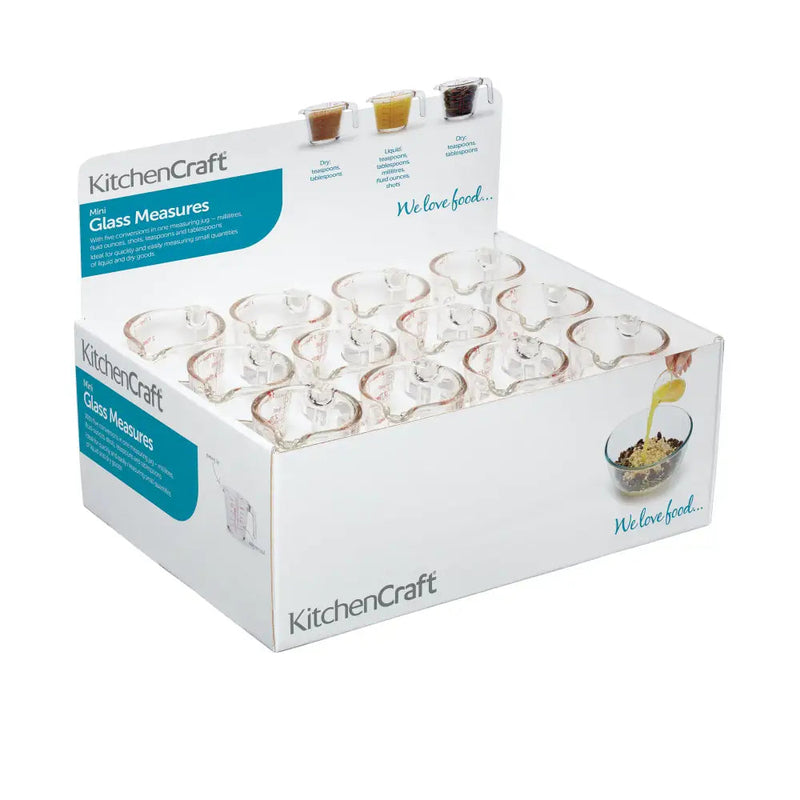 Ideal for quickly and easily measuring small quantities of liquids and dry goods, this mini glass measure includes 5 conversions in one measuring jug - millilitres, fluid ounces, shots, teaspoons and tablespoons.