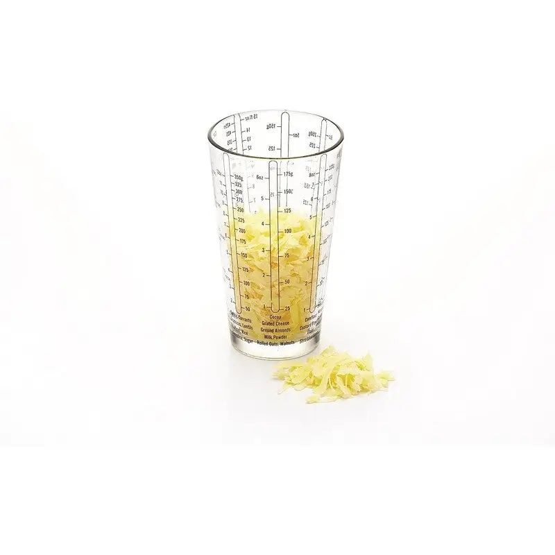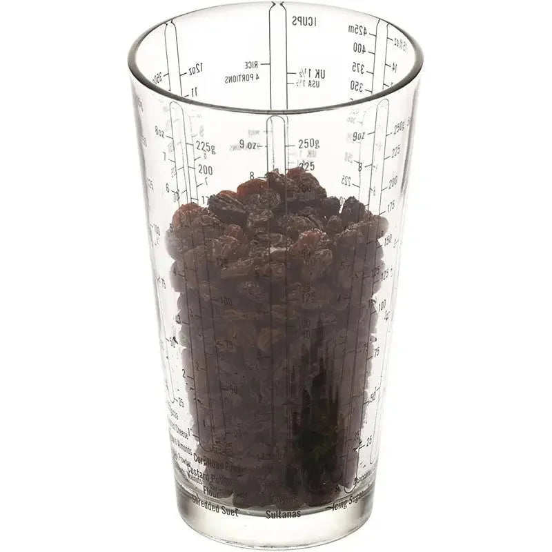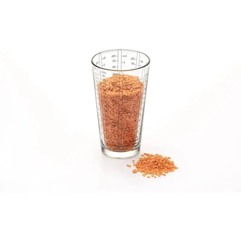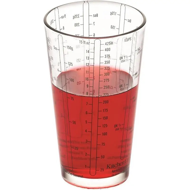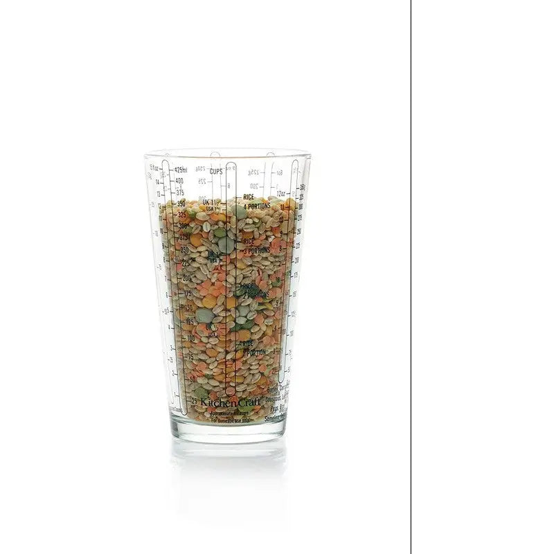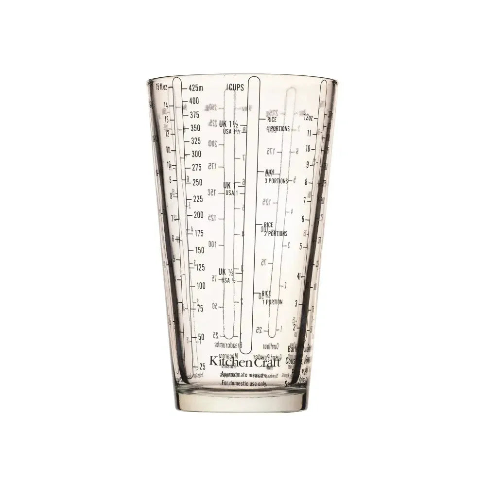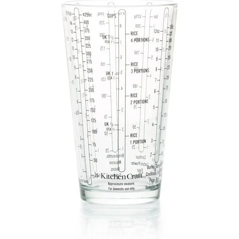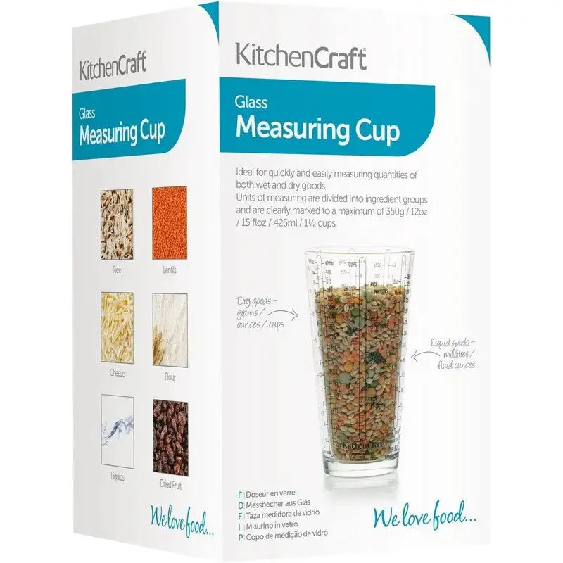Effortlessly measure various dry and liquid ingredients, including grams, ounces, millimeters, cups, and fluid ounces with the KitchenCraft 425ml Glass Measuring Cup. With precise measurement markings divided into key ingredient groups, this versatile cup is a must-have for any kitchen. Its ergonomic handle and clear glass design make it easy to use and read, while also being dishwasher safe for easy cleaning. Rest assured with KitchenCraft's 12-month guarantee for quality assurance.