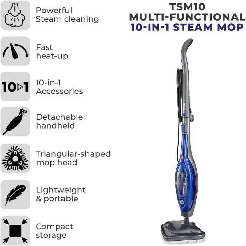 Experience powerful steam cleaning with the Tower Steam Mop, designed to eliminate up to 99% of bacteria without harsh chemicals. Its 1300W motor heats up in under 20 seconds, delivering up to 20 minutes of continuous steam from a 250ml water tank. Equipped with 10 versatile accessories—including brushes, a carpet glider, grout tool, and garment steamer—this mop tackles grease, grime, and dirt across tiles, carpets, hard floors, ovens, windows, and upholstery. Clean more efficiently and safely with this all-in-one steam cleaning solution.