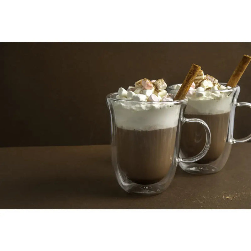These double walled mugs for hot cocoa help keep the chocolate warm. Each mug has a capacity of 350ml (0.5 pint, 12.5 fl oz), making them perfectly sized. Their insulation prevents heat from escaping. Its borosilicate glass is heat resistant, so comfort is always ensured when holding steaming hot drinks. Their luxurious look means they can be perfectly combined with indulgent drinking chocolates.