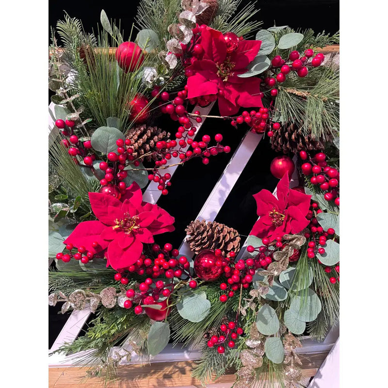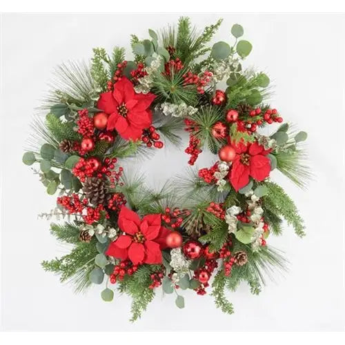 Add a touch of Winter to your home with our Poinsettia Wreath. The perfect wreath for this season featuring poinsettia and baubles. Its a timeless and stylish piece that you can use every year.