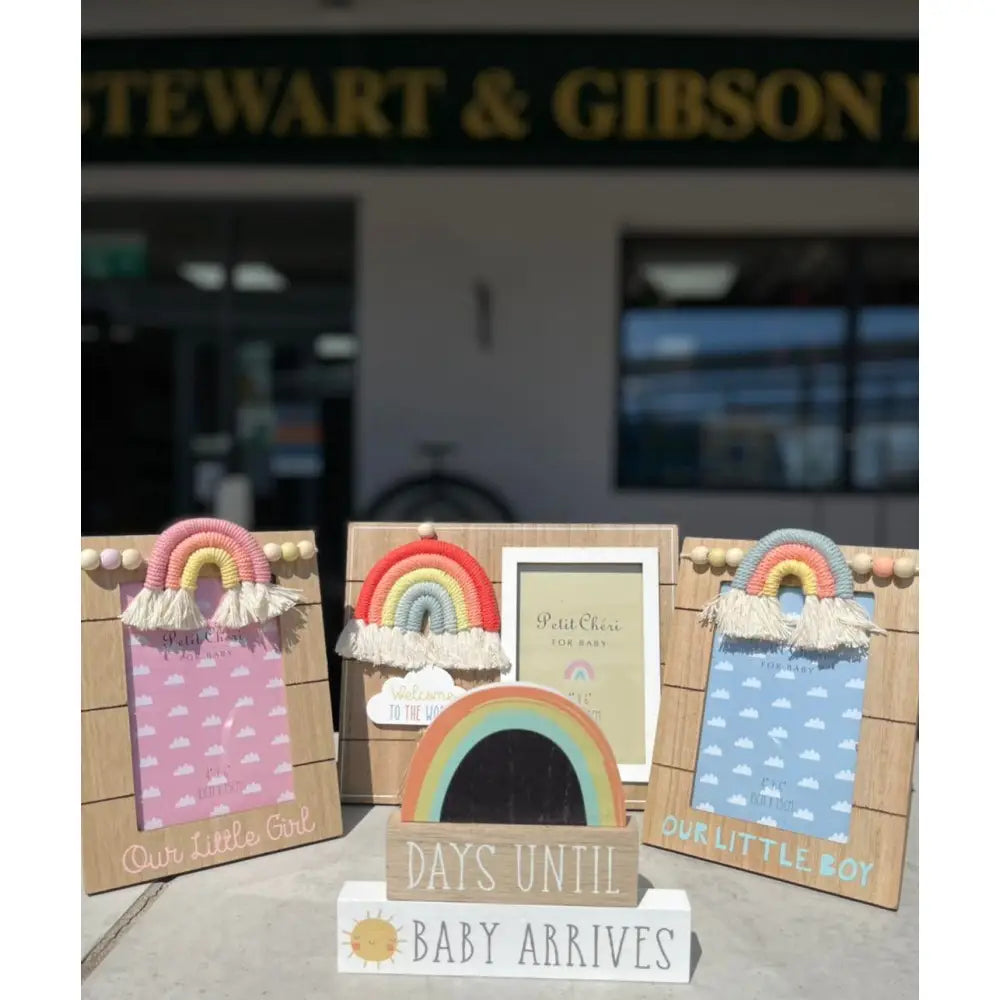 A fun way to count down the days to the new arrival, this MDF countdown plaque would look beautiful in any home. The rustic rainbow and sun design is a cheerful and lighthearted way to prepare for a new bundle of joy. Measuring 13.5cm x 16cm.