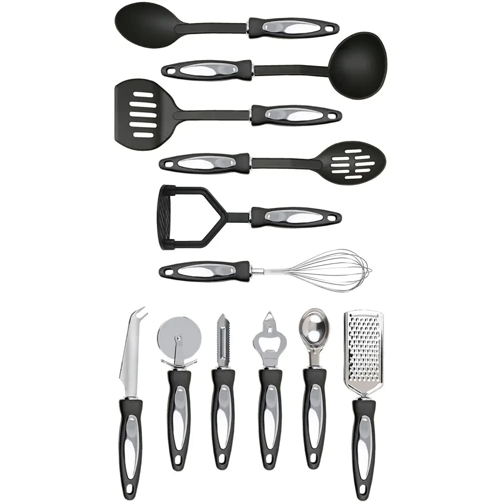 Featuring 5 non-stick utensils and 7 stainless steel tools, this set is ideal for kitting out your first kitchen or student accommodation. The non-stick utensils include: Solid Spoon, Slotted Spoon, Ladle, Slotted Turner and Masher. The stainless steel utensils include: Whisk, Cheese Knife, Pizza Cutter, Peeler, Bottle Opener, Ice Cream Scoop and Grater. Each utensil has hanging loops for easy storage and ergonomic handles with chrome effect detail for a comfortable grip. Dishwasher safe.