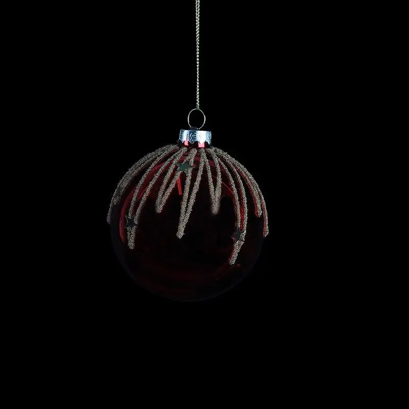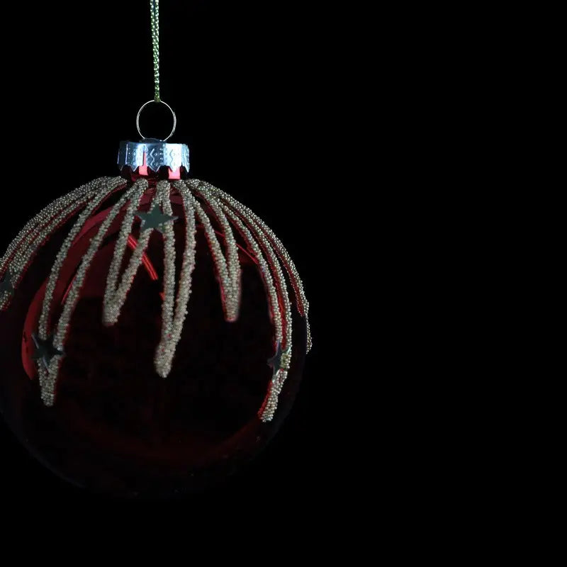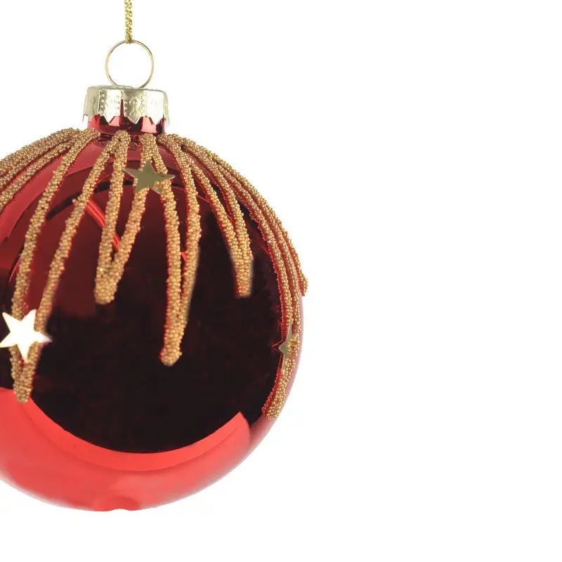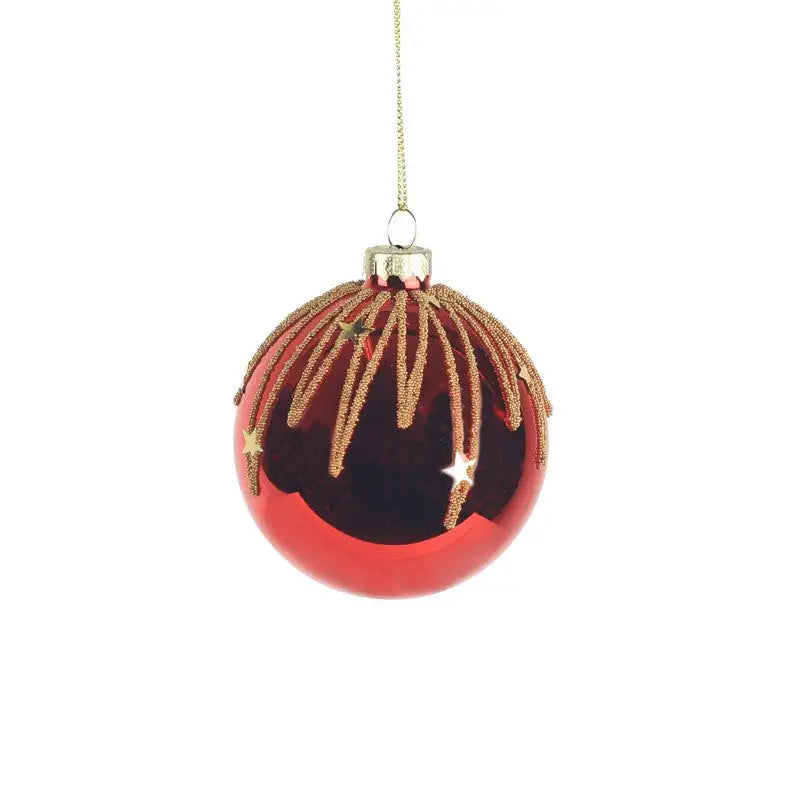 Expertly crafted, this 8cm Red Glass Bauble with Gold Design and Stars adds a touch of elegance to any holiday decor. Perfect for adding to your Christmas tree or as a gift for a loved one.
