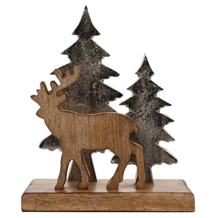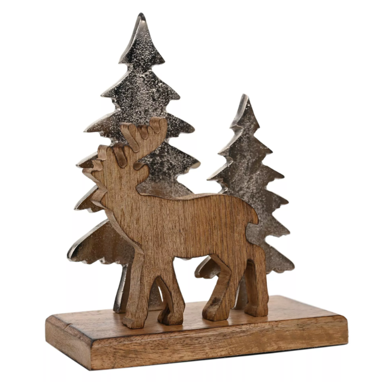 Add a festive touch to your home with this Reindeer with Tree Wood & Metal Decoration. Crafted from natural wood and sturdy metal, it blends rustic charm with modern design. Perfect for mantels, shelves, or tabletops, this elegant decoration brings warm holiday spirit and a stylish accent to any room. Enhance your seasonal decor effortlessly with this timeless piece.