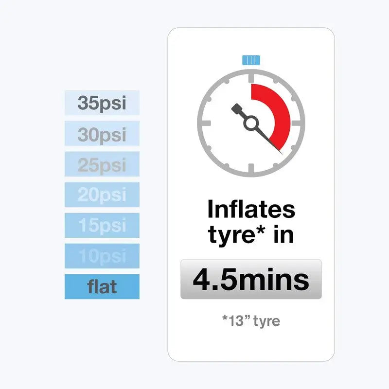 - HANDY TYRE MAINTENANCE. The RTC100 can inflate a 13 inch tyre from 0PSI to 35PSI in just 4.5 minutes, making it quick to top up tyres