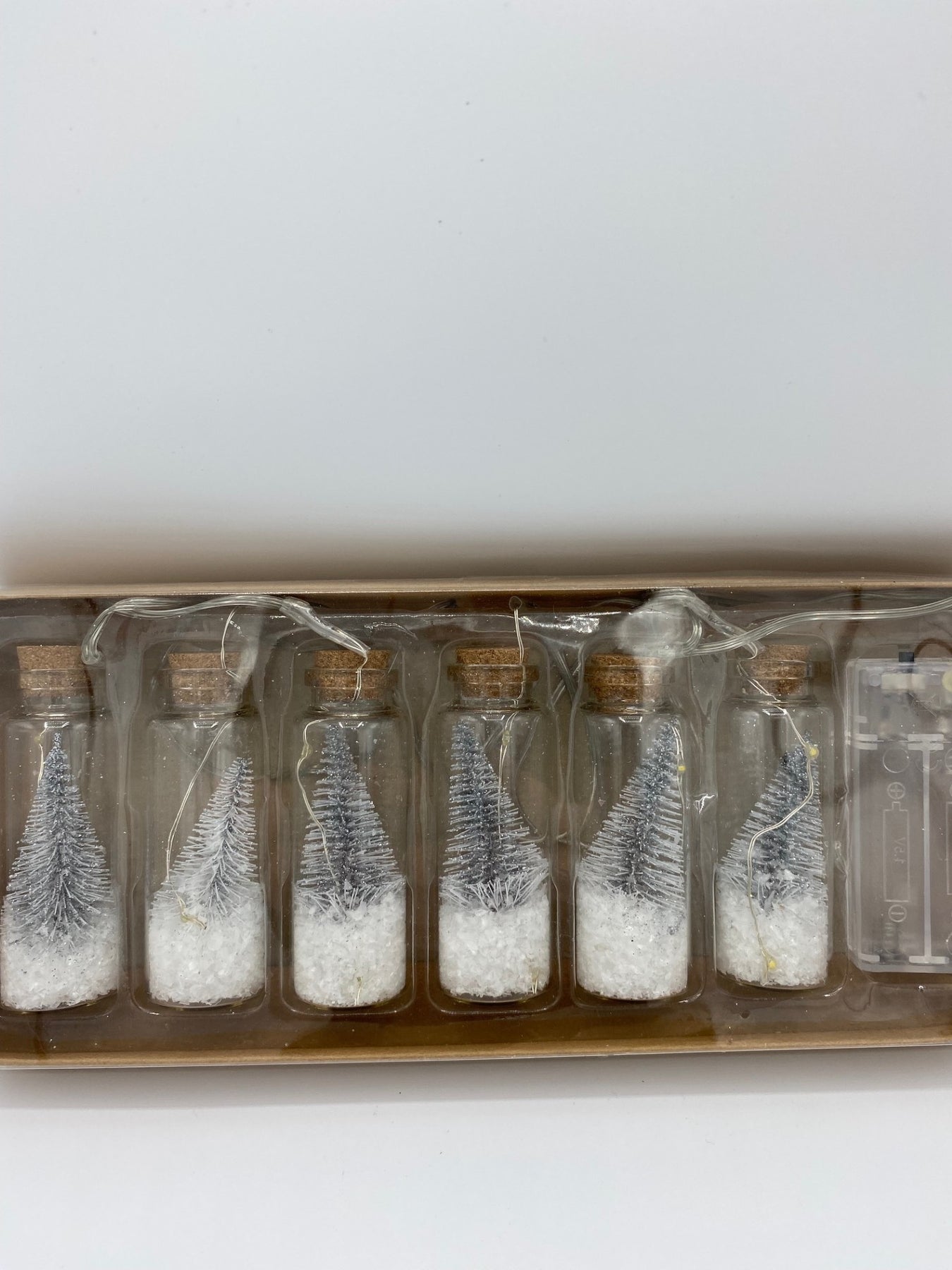 Introducing the elegant Silver Lit Tree Garland In Bottle X6 B/O. Illuminate your home with this stunning garland, featuring 6 beautifully crafted silver trees housed in clear bottles. With battery-operated lights, this garland provides a warm and inviting atmosphere for any occasion. Add a touch of sophistication to your decor.
