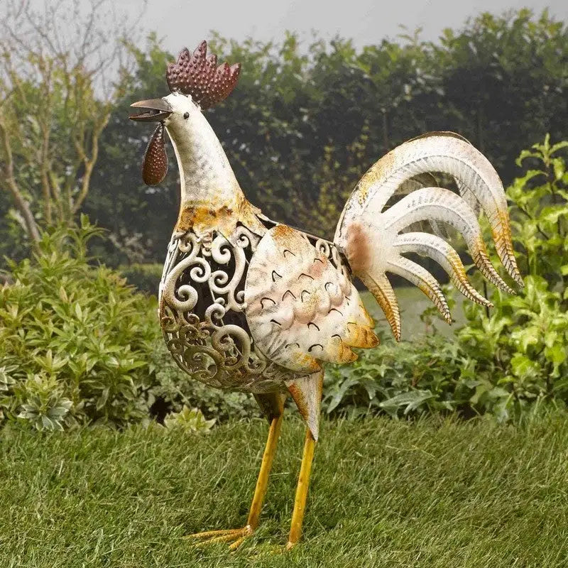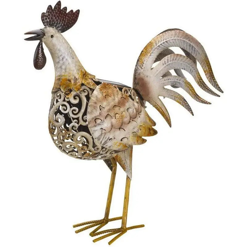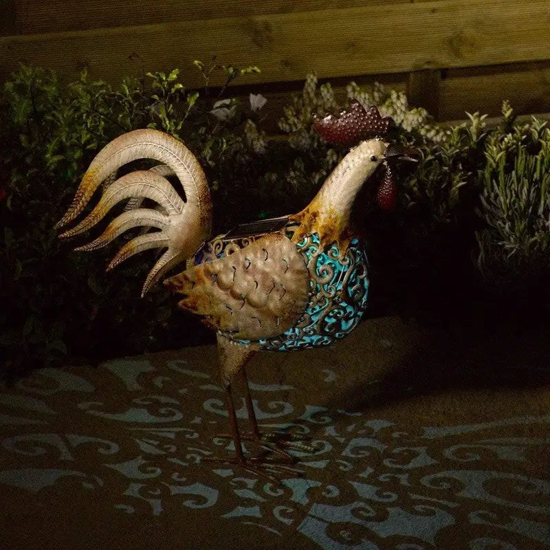 Smart Solar Iron Cockerel Silhouette with Light This colourful cockerel is so much more than an ornament to look elegant on a patio or flora rich border. The integrated solar panel absorbs sunlight during the day in order to glow within the frame when night falls, creating a dazzling effect around the bird. Features Made of powder coated iron which is weather resistant Integrated solar panels absorb energy during the day time LED light gives a gentle, luminous glow Options between white and coloured LED lights - just click a button to interchange Features a stake for stable use on grass Patterned frame produces a fantastic effect when solar light shines through Automatically illuminates in darkness No need for electric cables - money saving solar power.