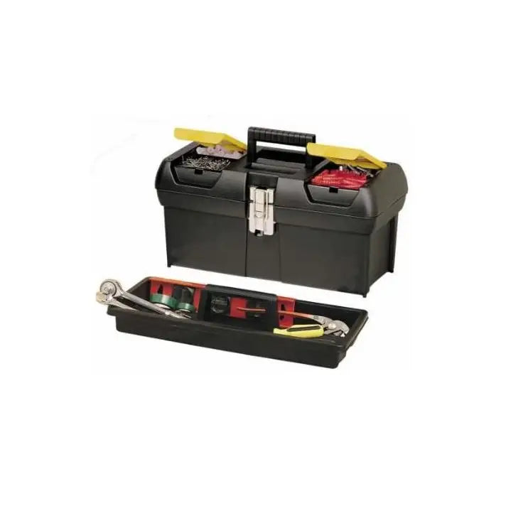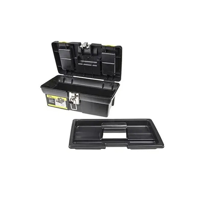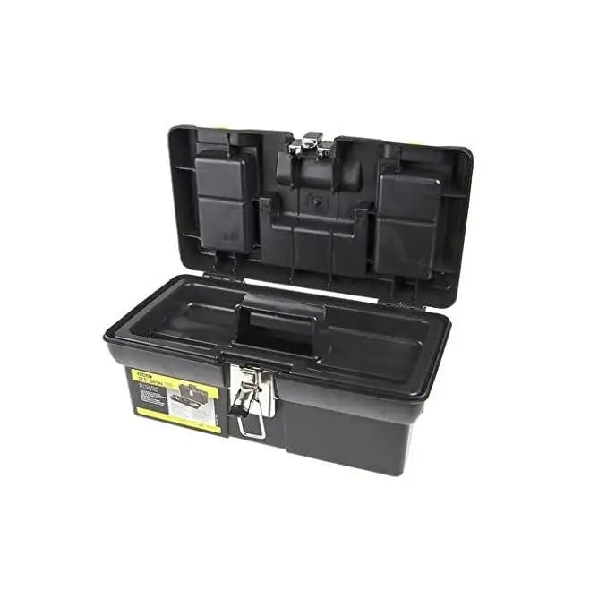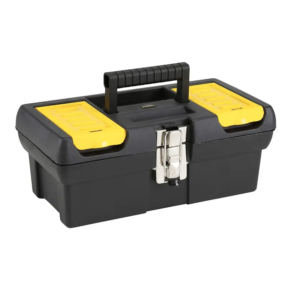 This robust and durable Stanley Metal Latch Tool Box is designed for exceptional stability and security. Its corrosion-resistant zinc-plated metal latch and heavy-duty steel construction protect your tools, while its yellow and black colour combination offers easy visibility. The 32cm / 12.5” size provides sufficient storage capacity.