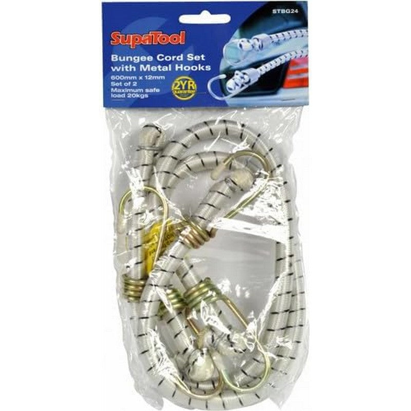 Secure your belongings with Supatool Bungee Cord Set, featuring 2 cords with durable metal hooks in either 600mm or 900mm lengths. Keep things in place during travel or storage.