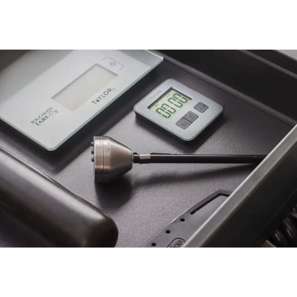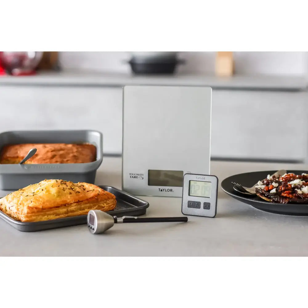 Put accuracy first in the kitchen. Taylors three-piece gift set includes key tools that will help you weigh ingredients, time bakes and read temperatures with precision. It includes a 100-minute digital timer, a set of compact digital scales and a digital probe thermometer. Weigh out dry and liquid ingredients with minimal fuss and less mess using the scales. Touchless Tare functionality means the display can be sent back to zero with a simple hand wave - with no need for messy hands to touch them.