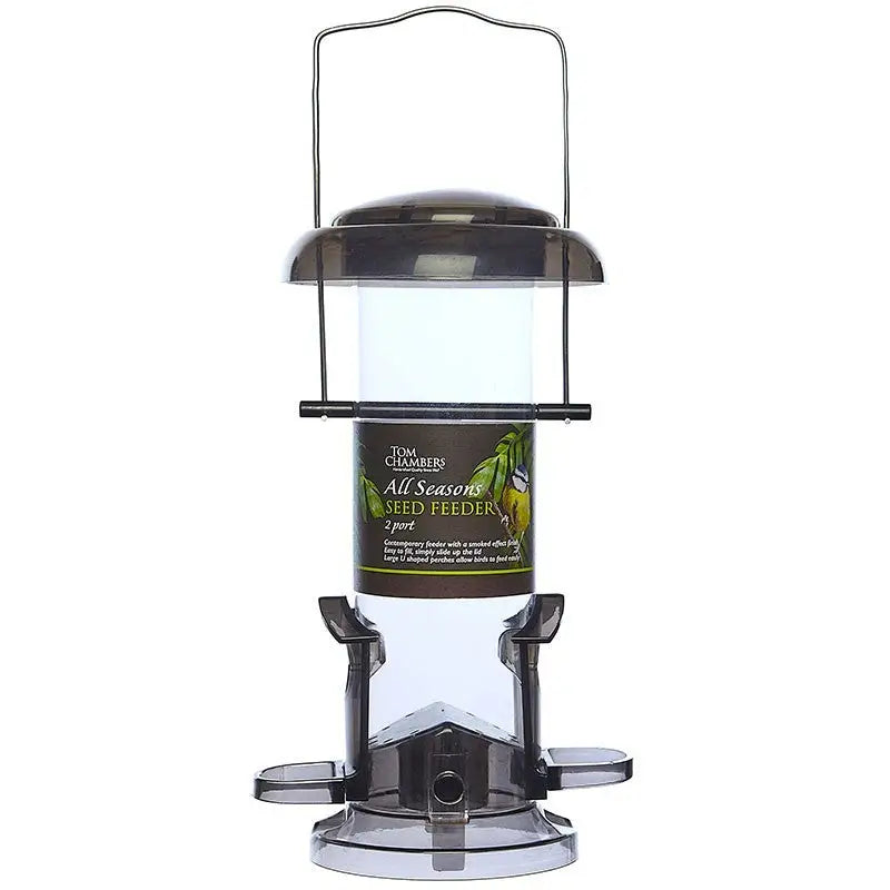 Genuine Tom Chambers two port all-seasons seed feeder. Perfect hanging feeder for all types of seeds and species of wild birds. Designed with a contemporary design and smoked effect finish. New wider base and large U shaped perches. All perches and ports are easily removable for ease of cleaning