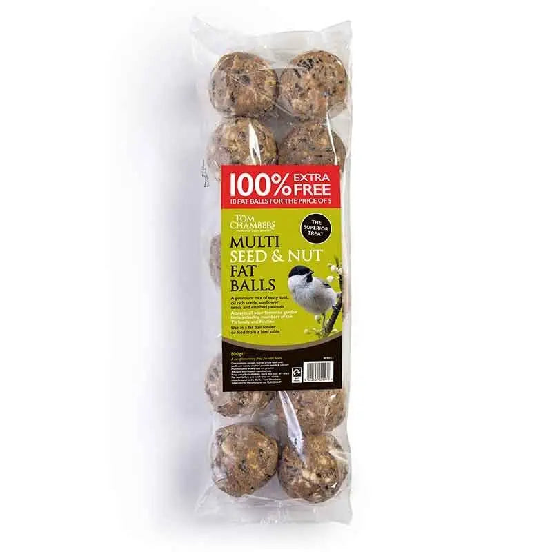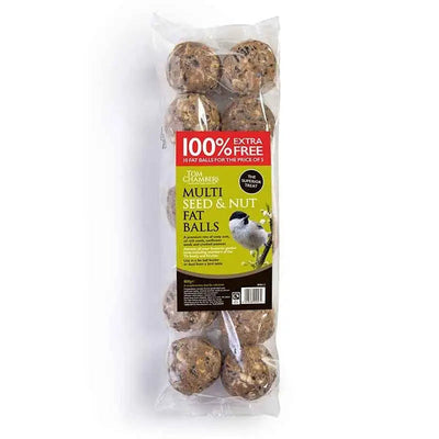 10 tasty Tom Chambers Multi Seed & Nut Fat Balls in an extra value pack for use in a fat ball feeder or feed from a bird table.